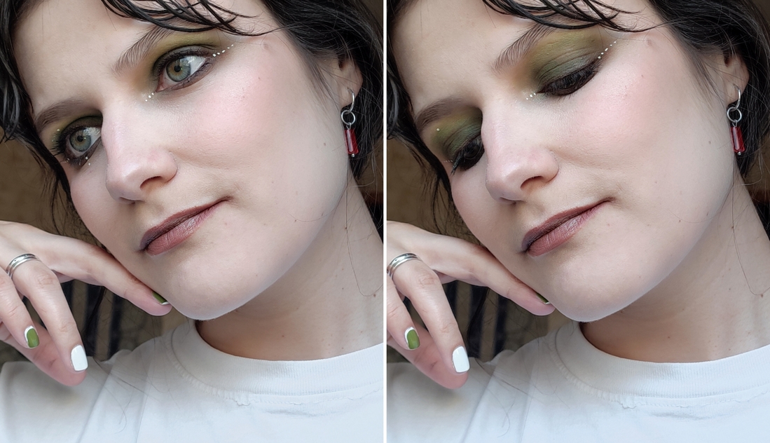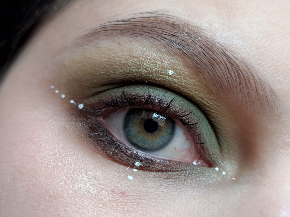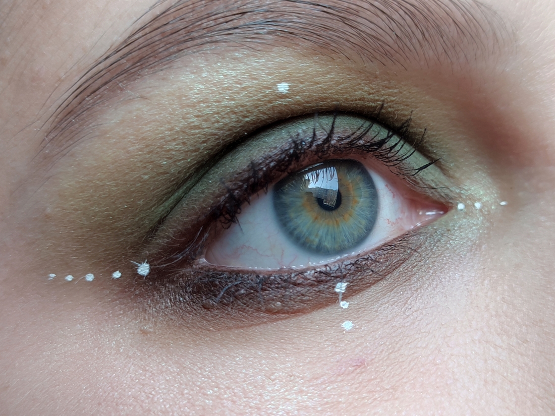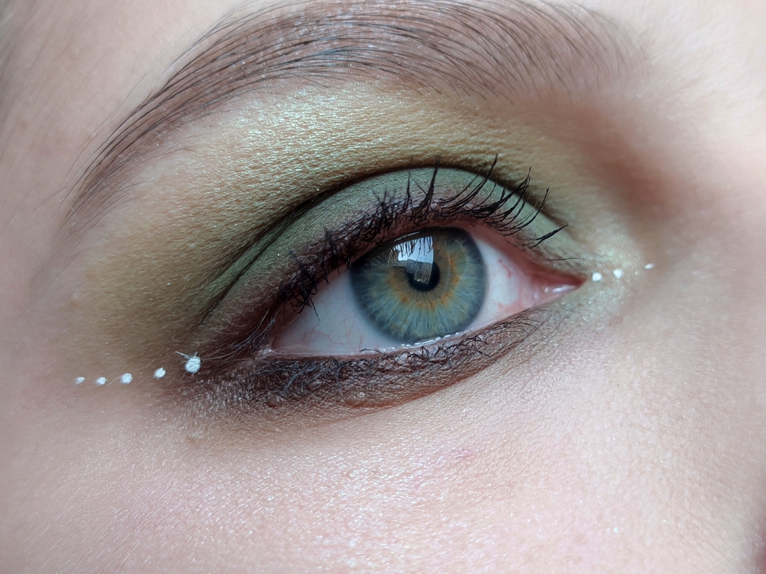 8. Время хайлайтера. У меня тут по логике «нужно все зелёное» — зеленый лунный свет от Beauty bomb. Я увлеклась, и сияние появилось и под бровью, и в уголке глаза. Миссия «сделать матовые глаза» провалена.