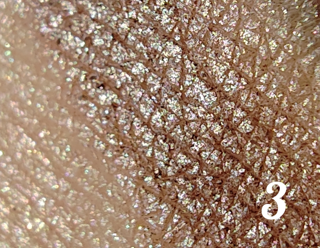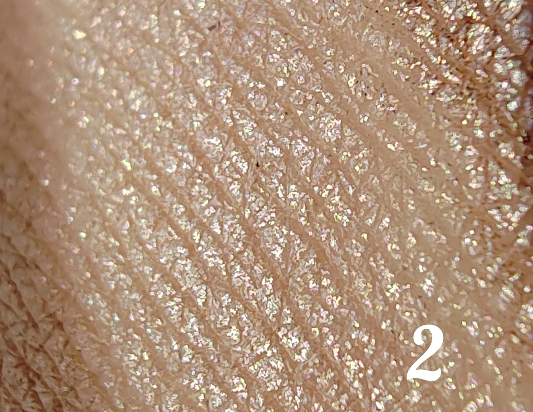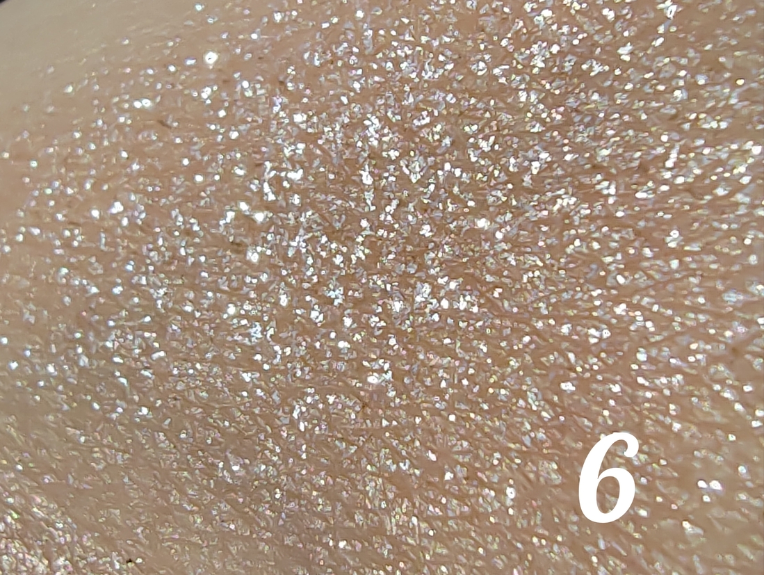 Огромное количество блесточек, больше похожих по форме на слюду, на прозрачной основе, которые на коже просто неощутимы, но блеск имеют многогранный и сверкающий. Его можно наносить отдельно, можно поверх металликов, везде ляжет красиво. Переносится отлично при помощи пальца, если же кистью, то осыпаний не избежать (можно потом убрать скотчем).