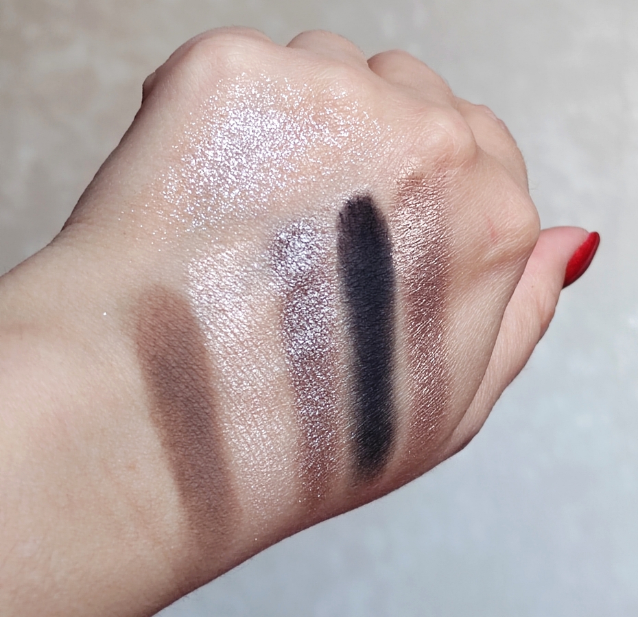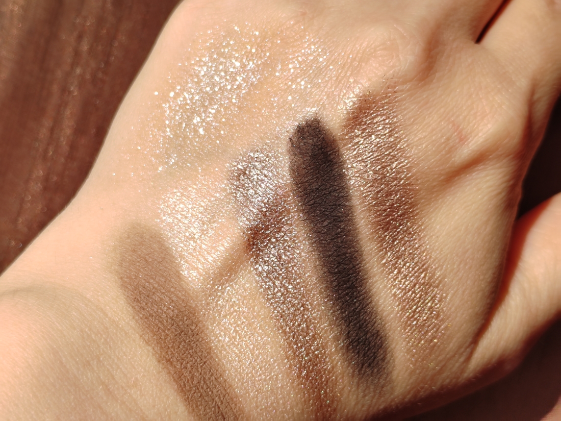Металлики (2,3 и 5) — все они нежные, сливочные по текстуре. Набираются пальцем (можно аппликатором) плотно, переносятся на веки без осыпаний. Не скатываются в течение дня.
