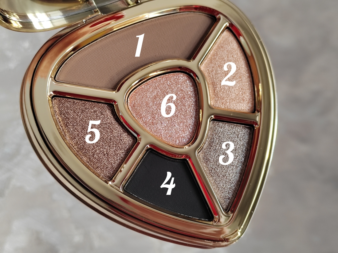 Многие уже писали про качественную упаковку — золотой глянцевый плотный картон, с полной информацией, с названием оттенков, и схемой для макияжа. Поэтому здесь я описание сократила.