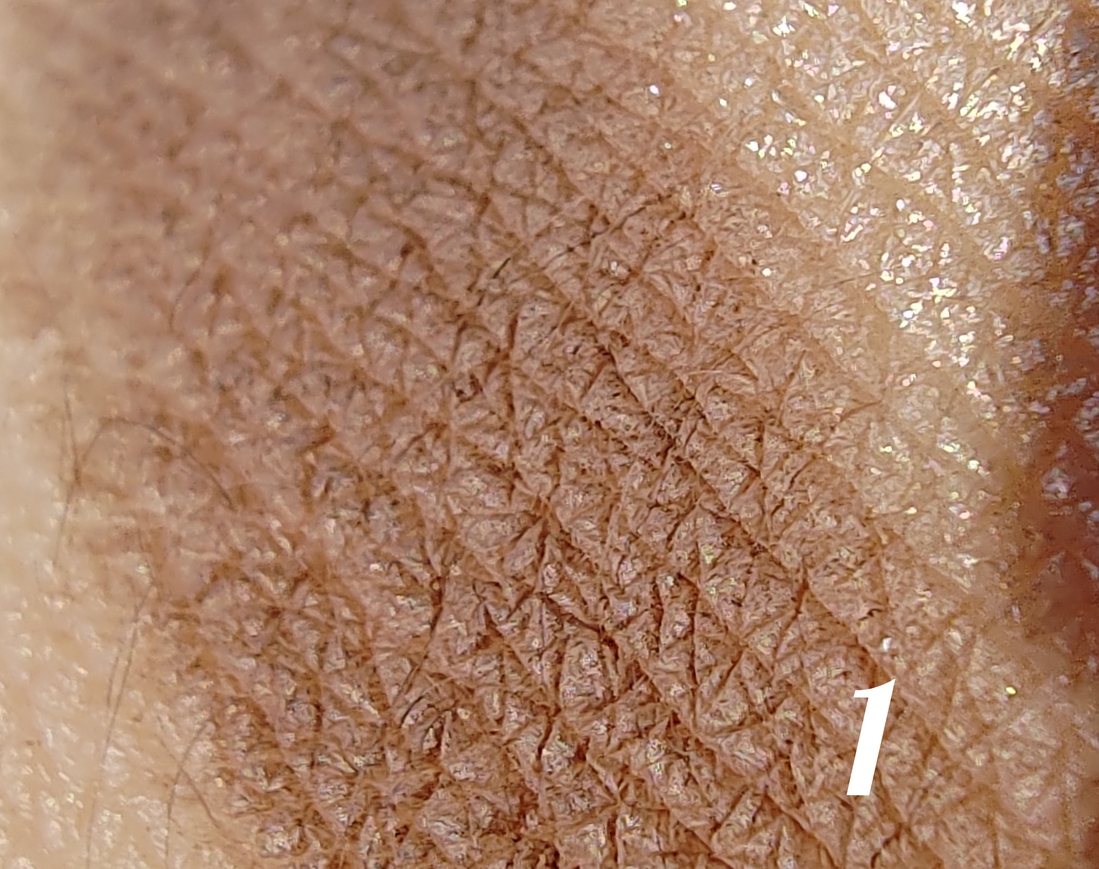 Рельеф кожи не подчёркивают, покрытие смотрится равномерным и гладкими.