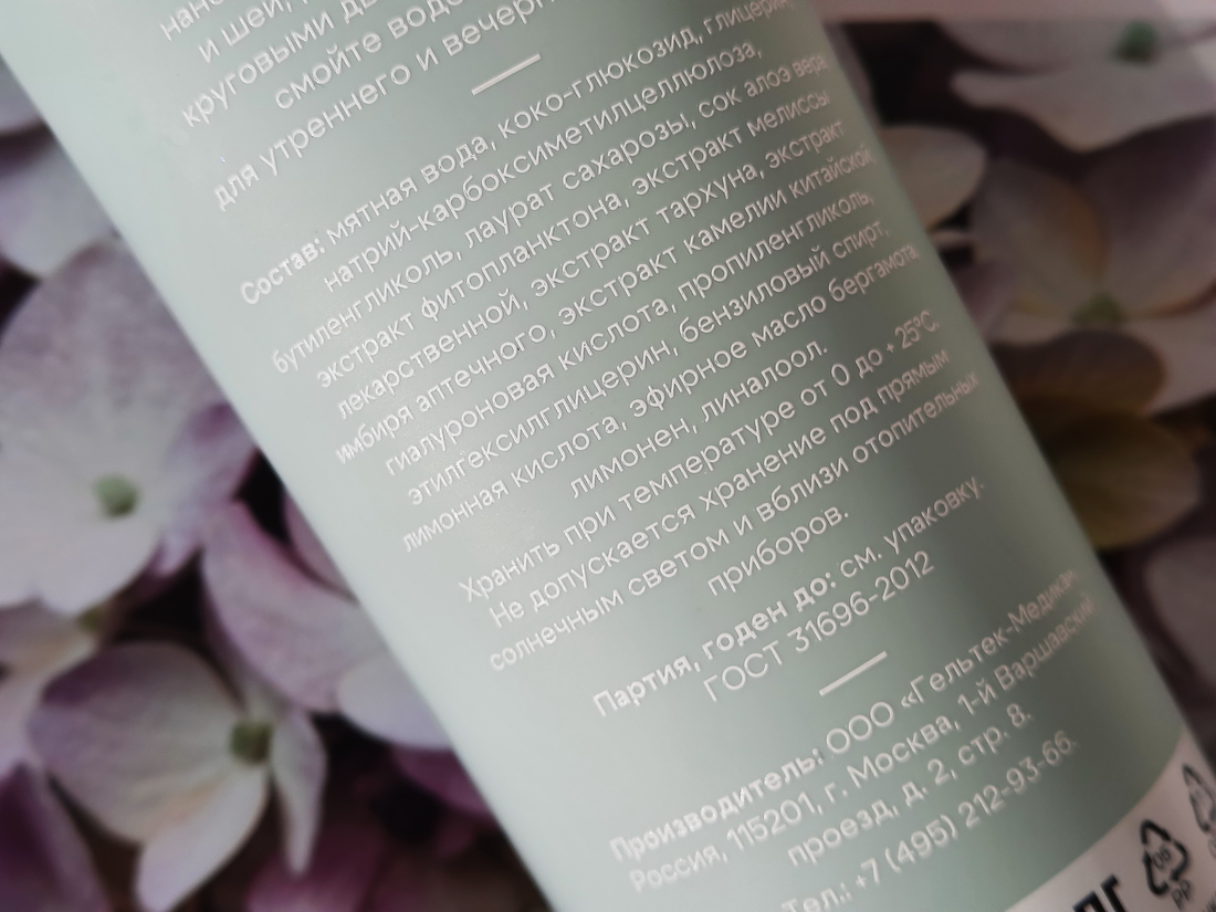 Состав интересный: в основе мятная вода (то есть что это — не ясно), есть эфирные масла, которые для чувствительной и радраженной кожи точно зась. Мягкие ПАВ, а также экстракты, якобы полезные: планктона, мелиссы, тархуна, имбиря, камелии. Гиалуроновая кислота, сок алоэ и эфирное масло бергамота.