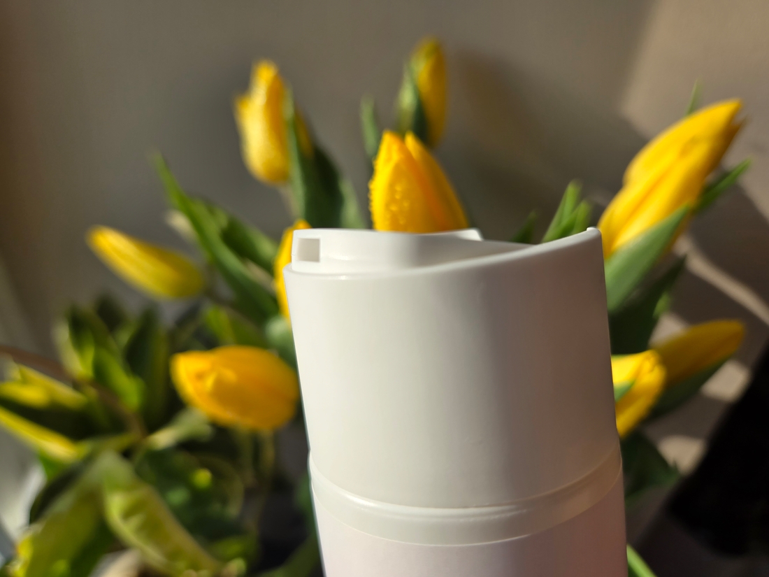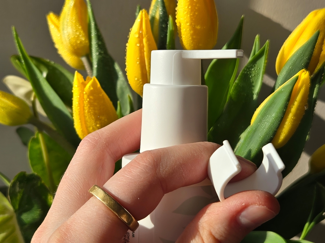 А для безопасной транспортировки есть вот такое кольцо, защищающее от случайного нажатия. Также с ним легко брать продукт с собой в багаж в путешествие, можно быть уверенной, что ничего не разольется.