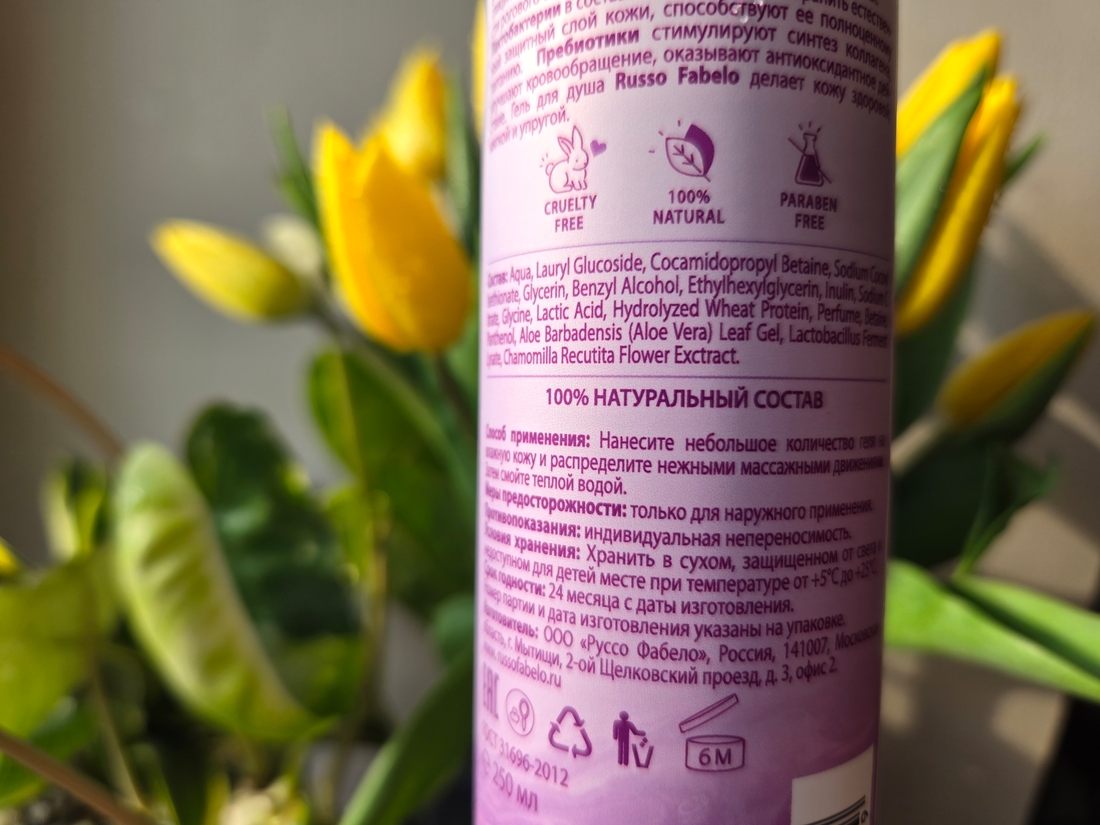На обороте также можно найти всю информацию. Гель для душа натуральный, бессульфатный, увлажняющий. Не содержит парабенов и не тестируется на животных, что большой плюс.