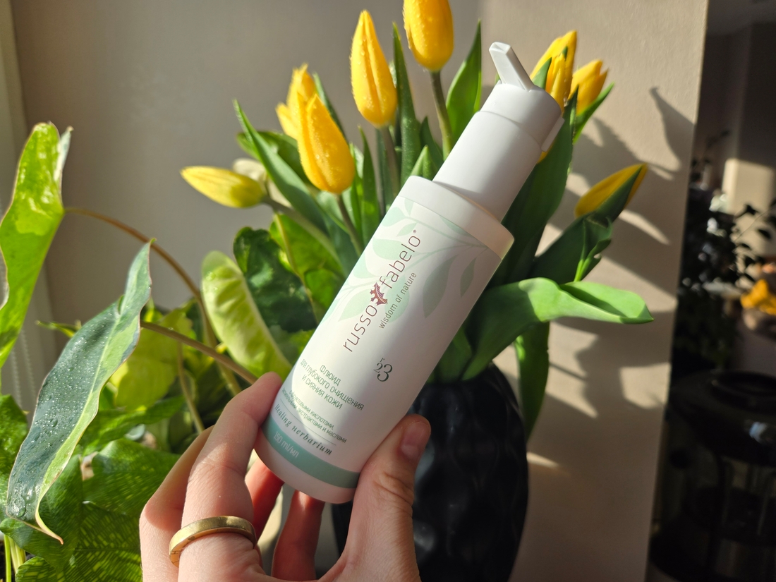 Начну с новинки — это Флюид для глубокого очищения и сияния кожи Russo Fabelo. Он идёт в объёме 150 мл, и хватает его на долго. Флакон с дизайном этикетки в светлых экологичных тонах очень приятен глазу.