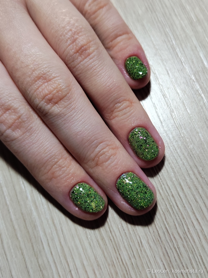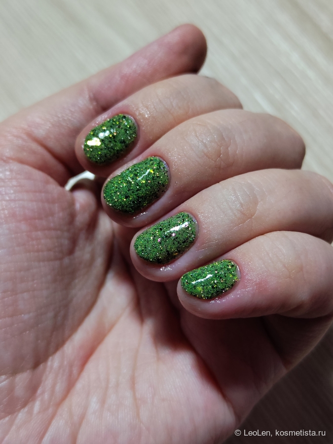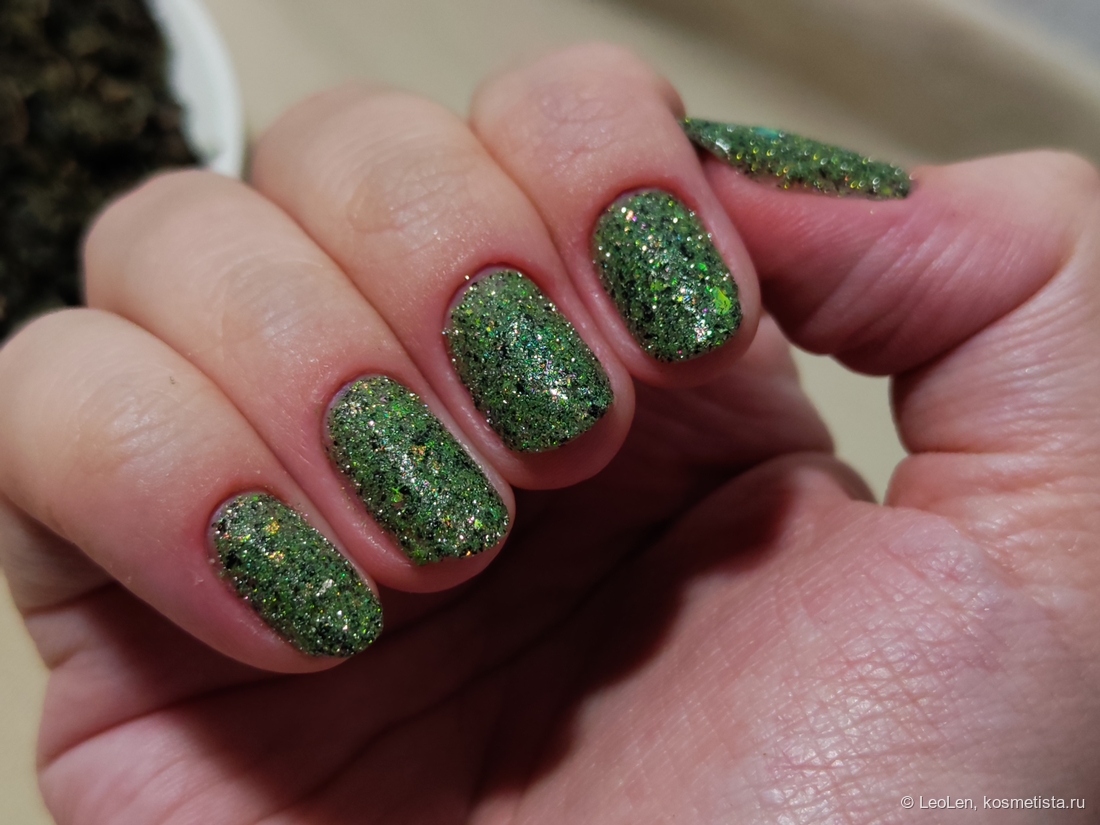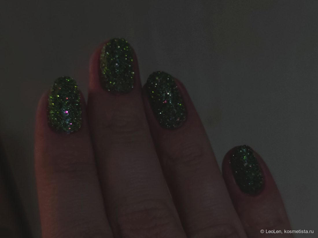 Для плотного зелёного цвета нужно наносить в 2 слоя. Имеет вкрапления чёрной потали. Ещё там замешана слюда, которая переливается от холодного розового в зелёный. Ну и естественно та самая отражайка :)