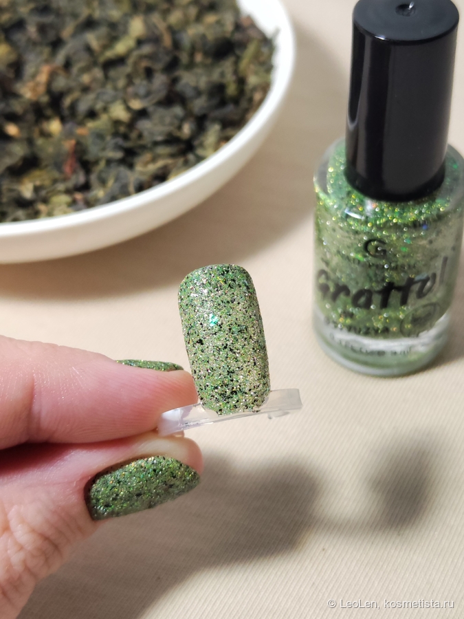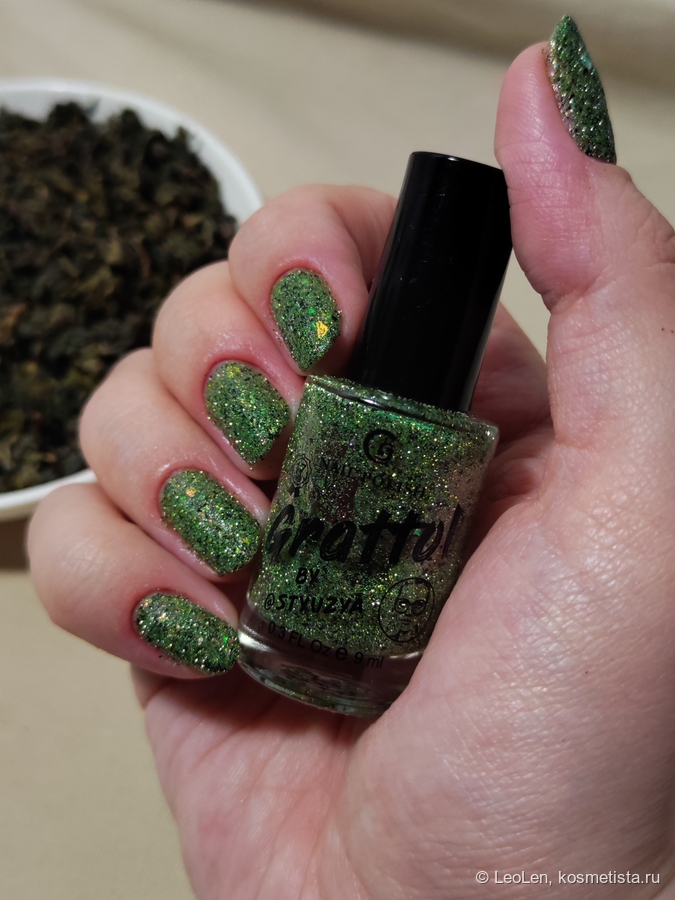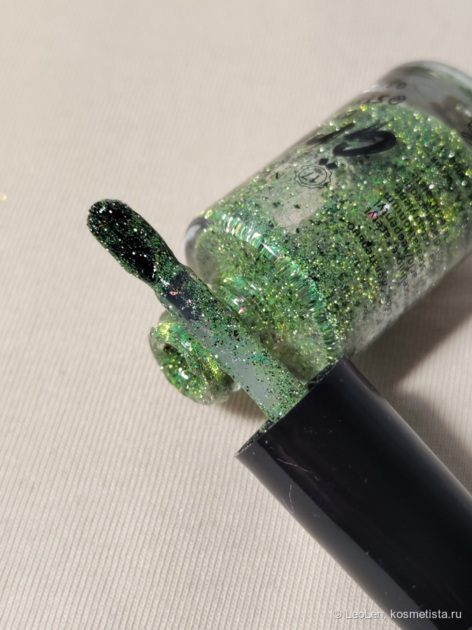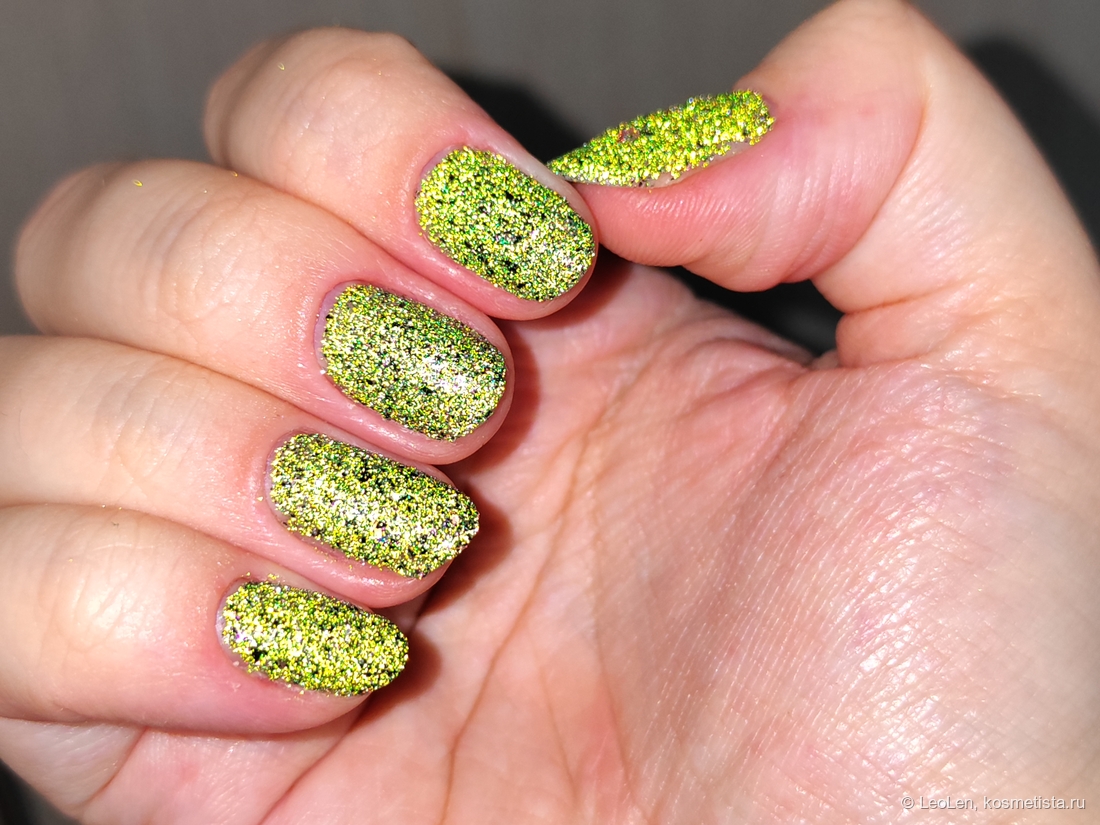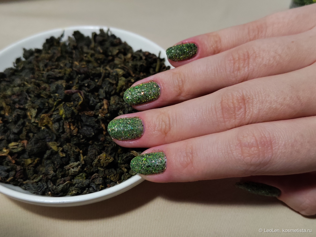 Для плотного зелёного цвета нужно наносить в 2 слоя. Имеет вкрапления чёрной потали. Ещё там замешана слюда, которая переливается от холодного розового в зелёный. Ну и естественно та самая отражайка :)