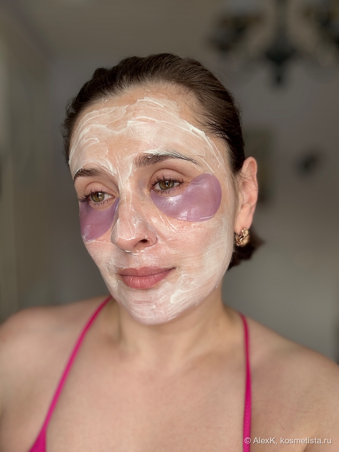 На коже маска ощущается комфортно. Мою сухую шкурку заметно напитывает, смягчает и увлажняет. В процессе чувствую лёгкое и комфортное охлаждение. А после использования вижу напитанное, сияющее, посвежевшее и чуть подтянувшееся лицо.