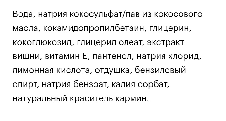 Состав основан на мягких ПАВах. Из полезностей — экстракт вишни, витамин Е и пантенол, но для меня это не столь важно, так как считаю, что смываемый продукт не успевает за столь короткое время пребывания на коже как-то воздействовать на неё.