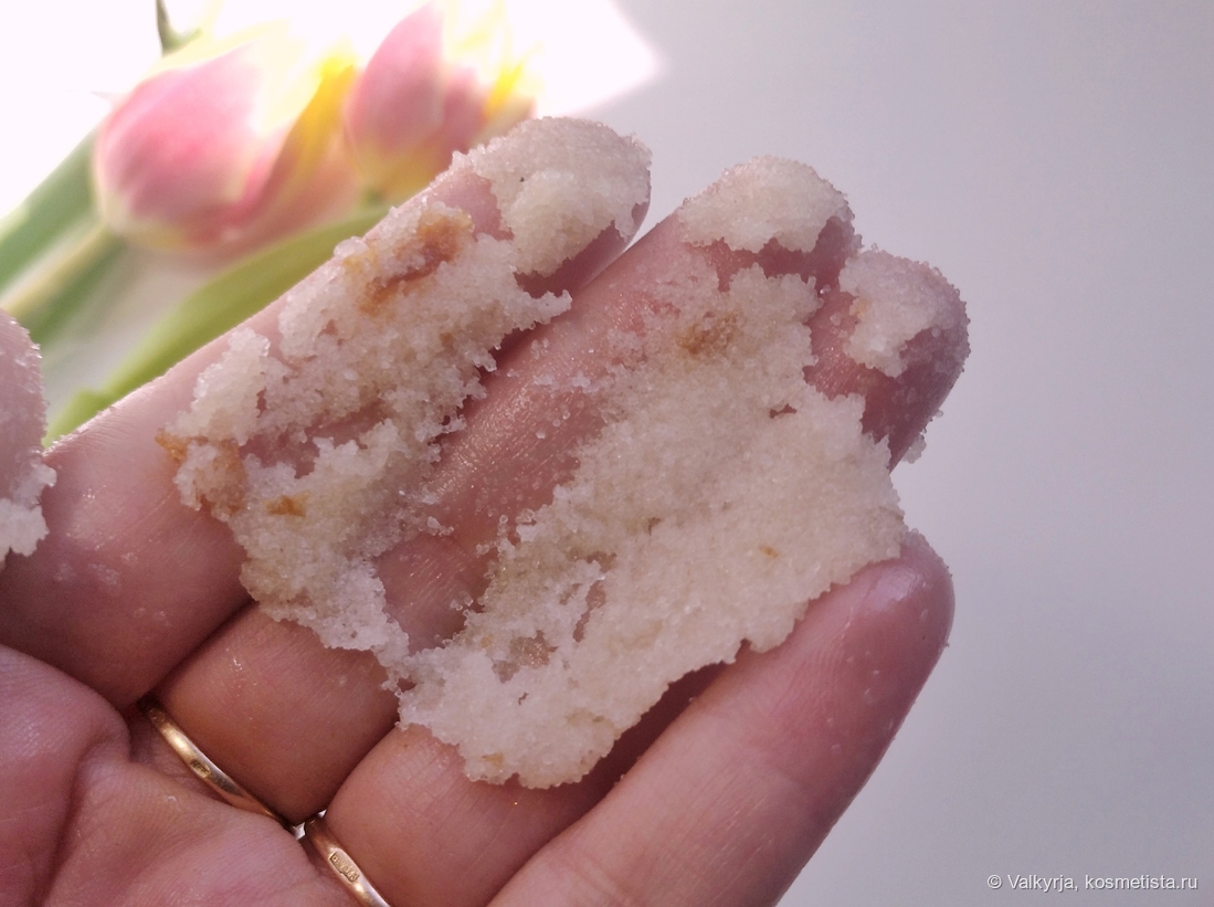 Из полезностей — витамин Е, экстракт вишни и необычный компонент для среднетипичных скрабов — сквалан. Скрабирующая основа состоит из мелкой соли и сахара.