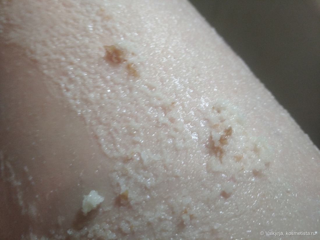 >> Текстура скраба удивила сразу после вскрытия пачки. Я ожидала увидеть обычный сухой скраб, а увидела масляный комок «манной каши». Масел в составе много, но на коже они не образуют бесячего жирного слоя.