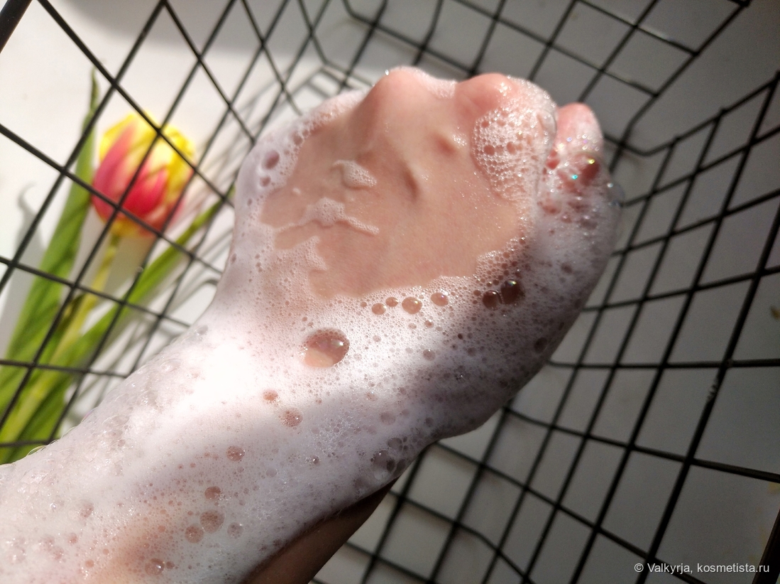 >>Пенообразованиедостойное, особенно для средства на мягких ПАВах. Пена получается не очень обильная, но весьма пушистая. Ее хватает на полноценное мытье, и она легко смывается с кожи без остаточного ощущения неполного очищения.