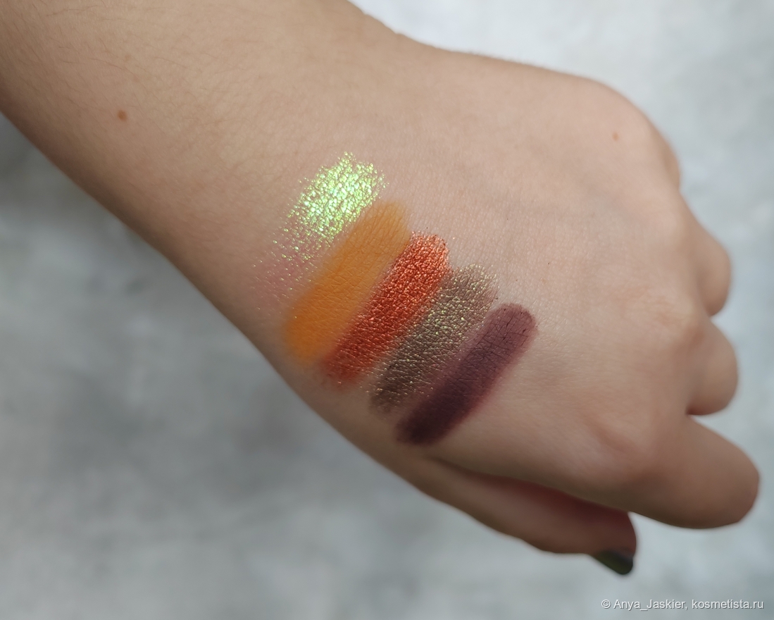 А теперь про самое интересное — наполнение. Палитра гармоничная и яркая, два матовых, два металлика и сумасшедший горящий мультихром. Все цвета прекрасно сочетаются друг с другом, качество тоже на высоте. Свотчи сделаны пальцем без базы, рассказывать про оттенки буду не по порядку (нумерации и названия они не имеют).