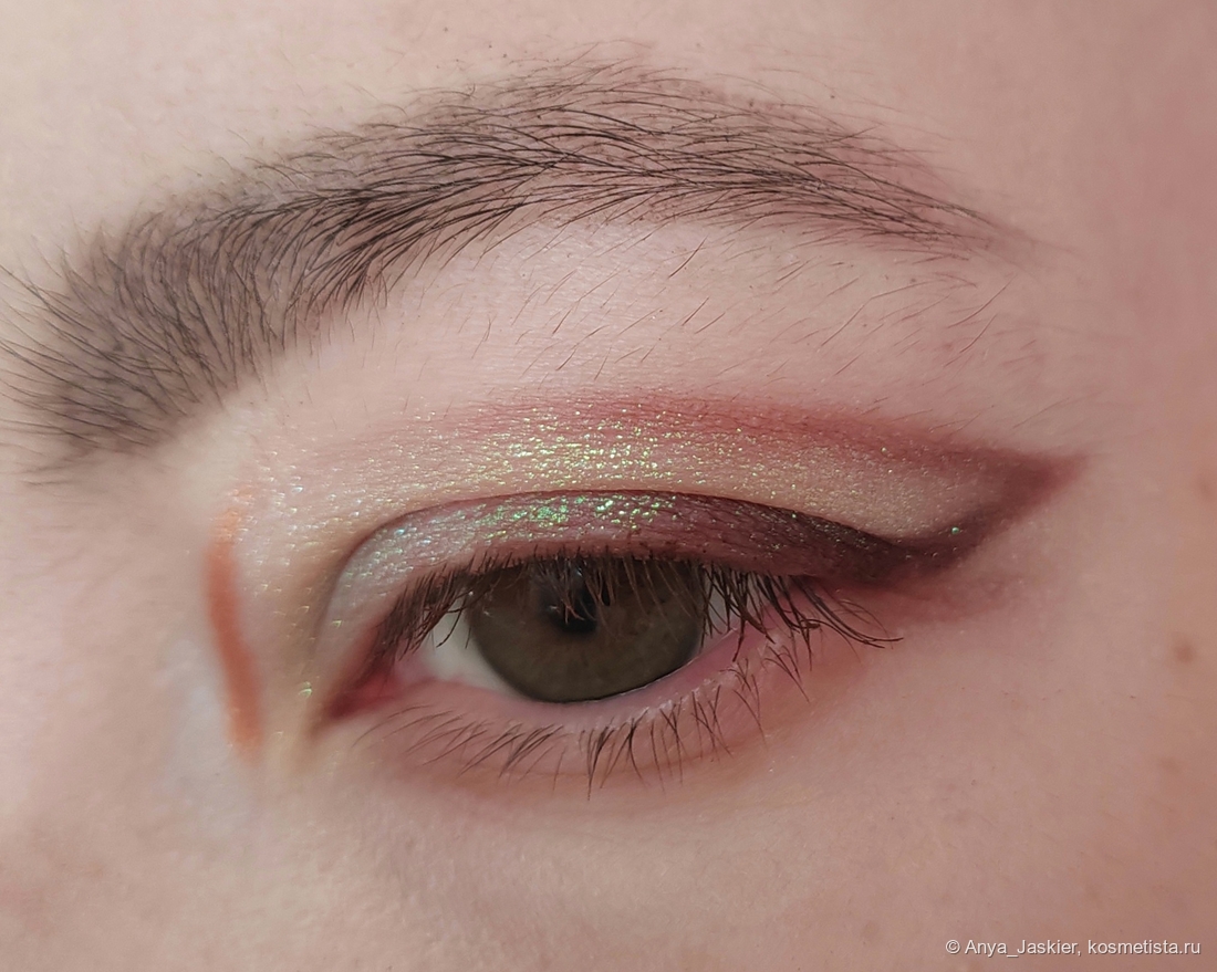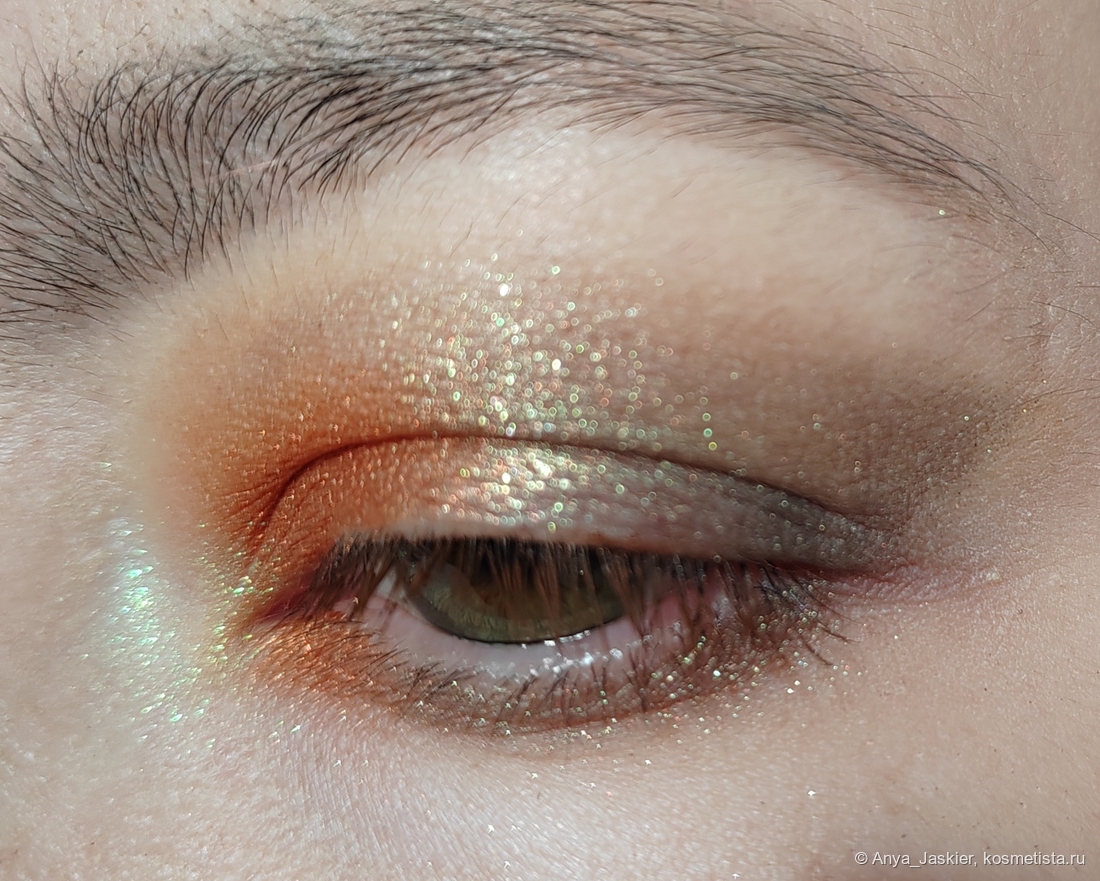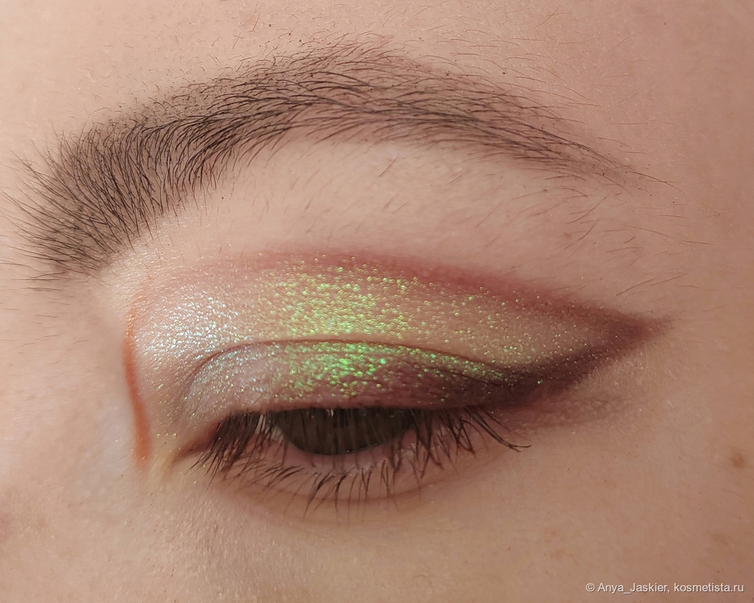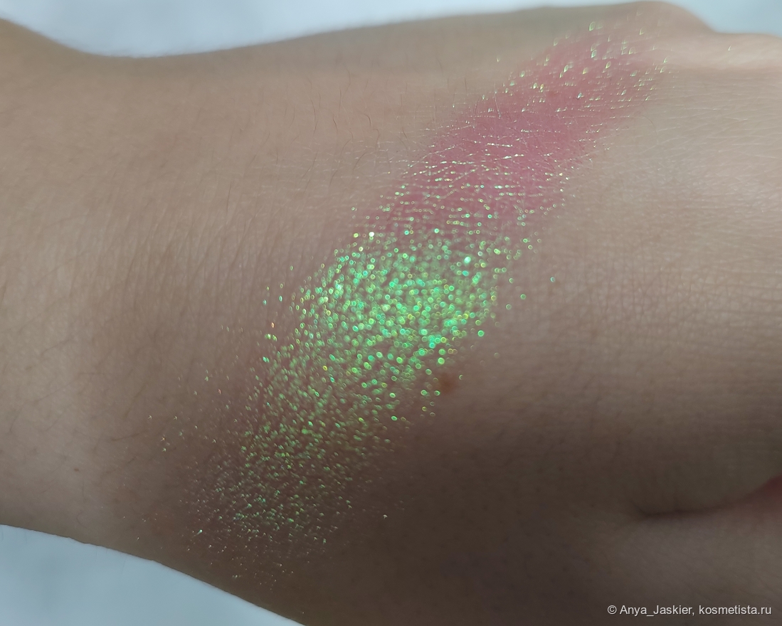 Мультихром. Салатово-бирюзово-бело-розовый хлопьевидный герой палетки, с помощью которого можно хвастаться перед инопланетянами своими макияжами, ослепительный как фейерверк и освежающий не только взгляд, но весь образ. В тонкий слой сверкает при определенном угле зрения, после наслоения способен ослепить окружающих. Прозрачная база позволяет использовать его как хайлайтер или топпер, а ещё он потрясающе выглядит соло в уголке глаза. В солнечном свете уходит в зеленый, в тени выдает чуть ли не голубой. Для равномерного покрытия его нужно немного растереть пальцем, иначе может лечь кусками. Блёстки очень любят залипнуть на коже, так что демакияж не самый простой, а ещё они прекрасно цепляются ко всем поверхностям, которые по неосторожности можно задеть пальцем или кистью. Но этому красавцу все простительно!