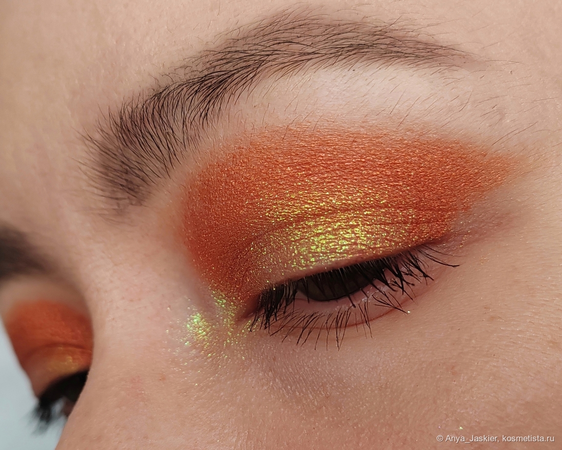 Оранжевый металлик. Кричащий огненно-рыжий, он буквально горит на веках. Наносится пальцем, не требует наслаивания, почти не осыпается. С кистями дружит, но нужно подобрать подходящую. Демакияж простой, блёстки по лицу не разбегаются.