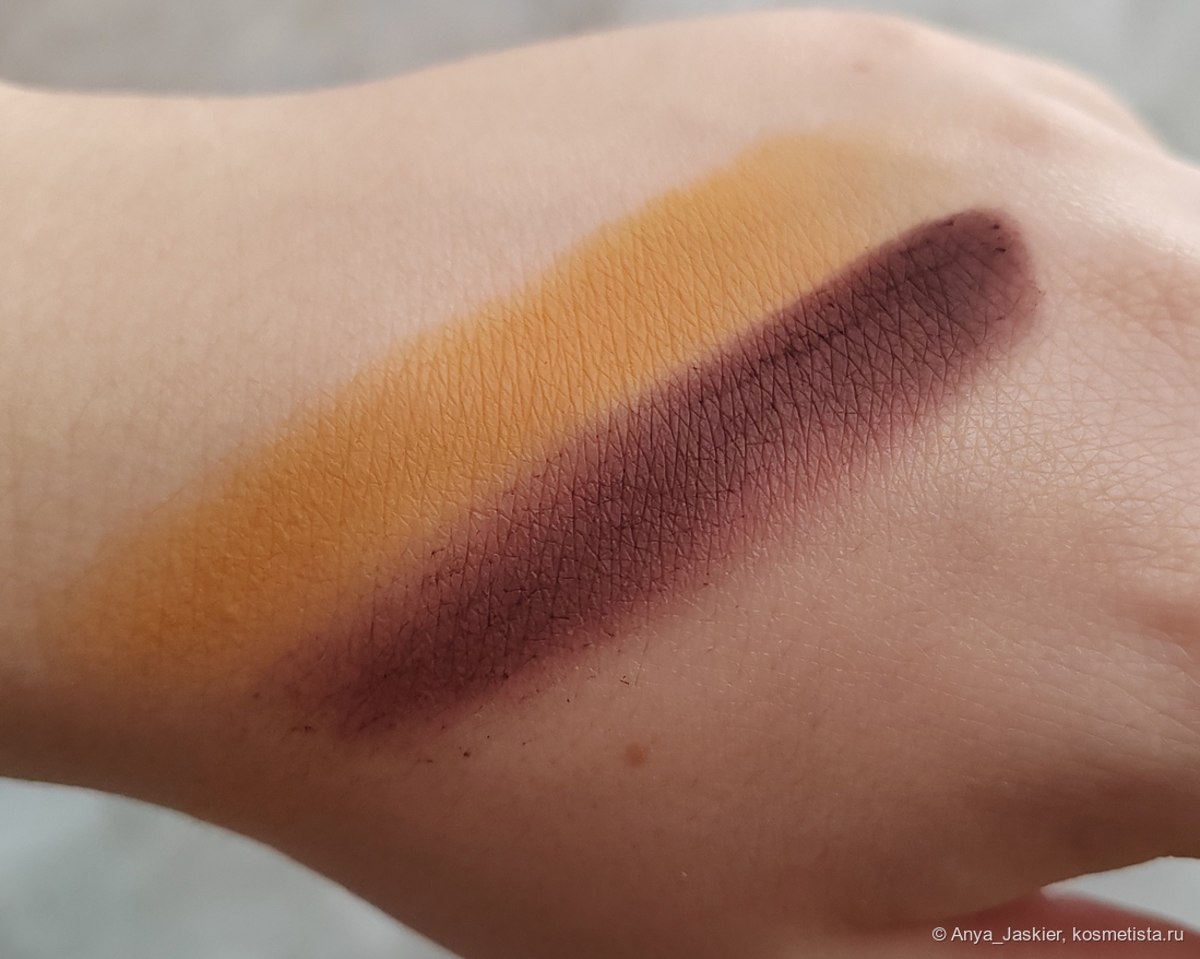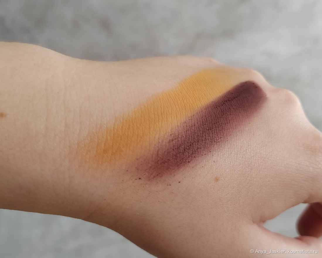 Жёлтый матовый. Горчичный теплый цвет, очень мягкий по текстуре, легко тушуется в дымку или наслаивается до концентрации как в рефилле. Пыльный, при нанесении кистью я сначала разок втаптываю его в руку, чтобы избежать осыпаний. Пальцем тоже наносится и тушуется на отлично.