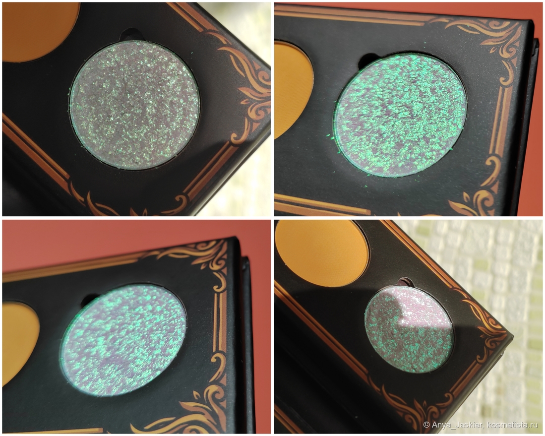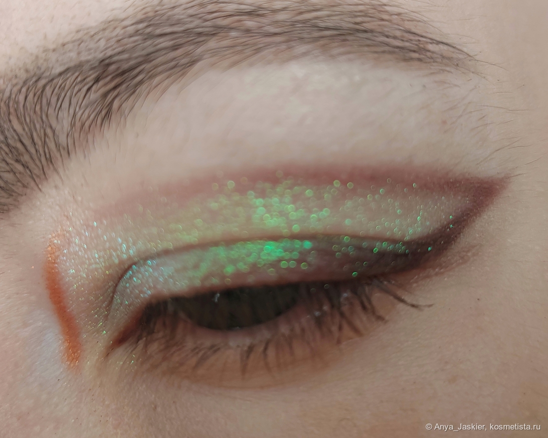 Зелёный металлик. Пыльный серо-зелёный оттенок, в окружении других цветов выглядит сдержанно благородным. В искусственном свете уходит в серебро. По текстуре частицы крупнее и летучее, чем в оранжевом, но с кистями работает лучше. Пожалуй, самый нюдовый оттенок палетки, особенно если нанести тонким слоем. При нанесении любит осыпаться, за ним глаз да глаз нужен. Демакияж простой, блёстки на коже не залипают.