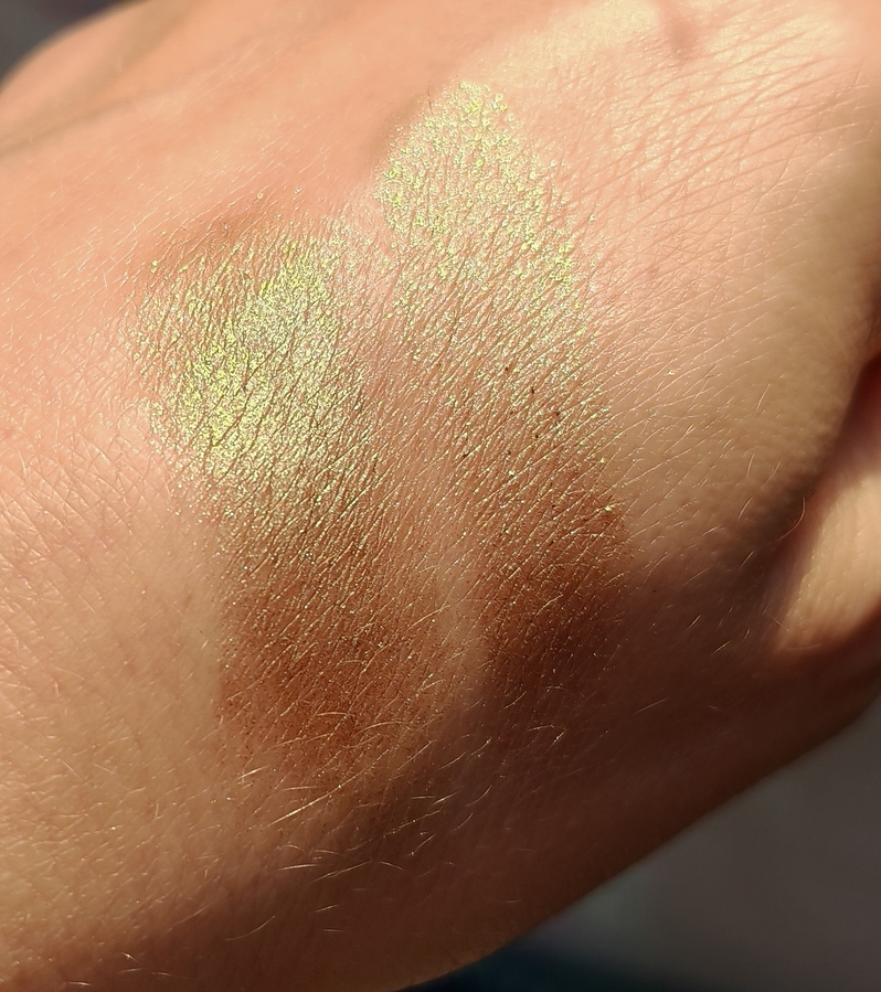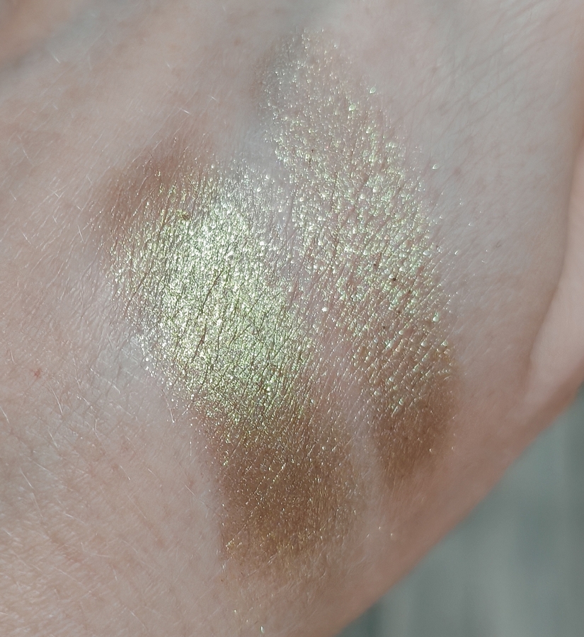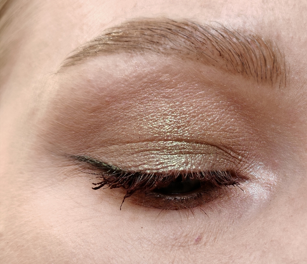 Apus — зелёная сияшка на коричневой базе с вкраплением зелёных и золотистый блесток. Блестки не крупные, на веке не ощущаются.