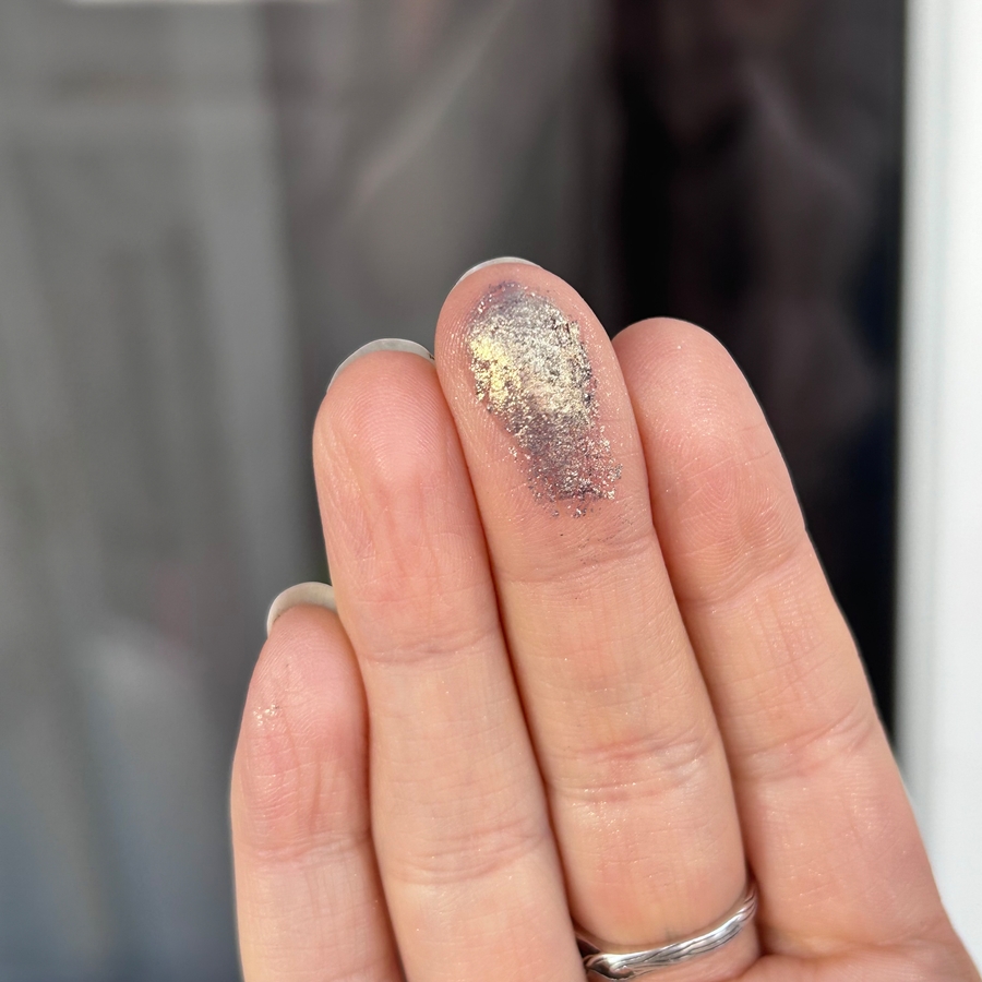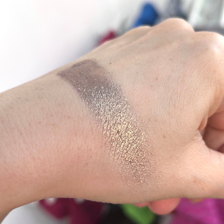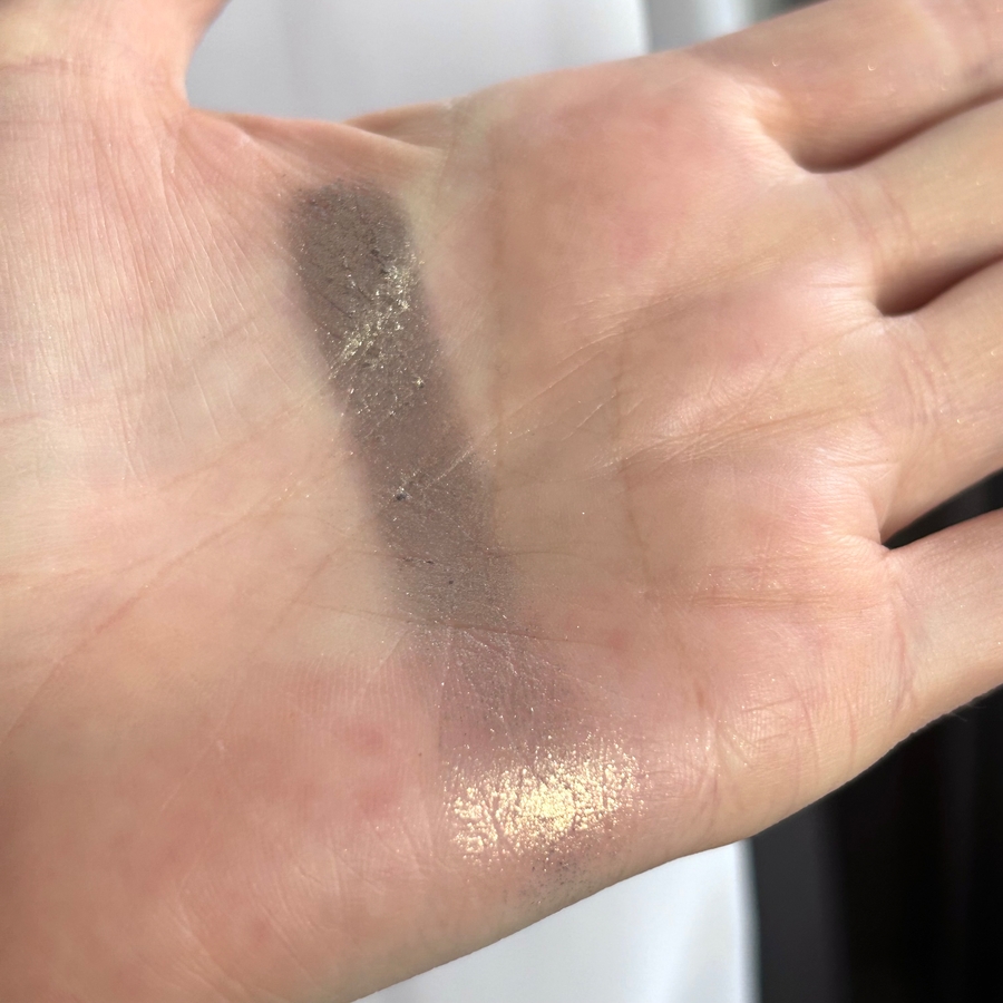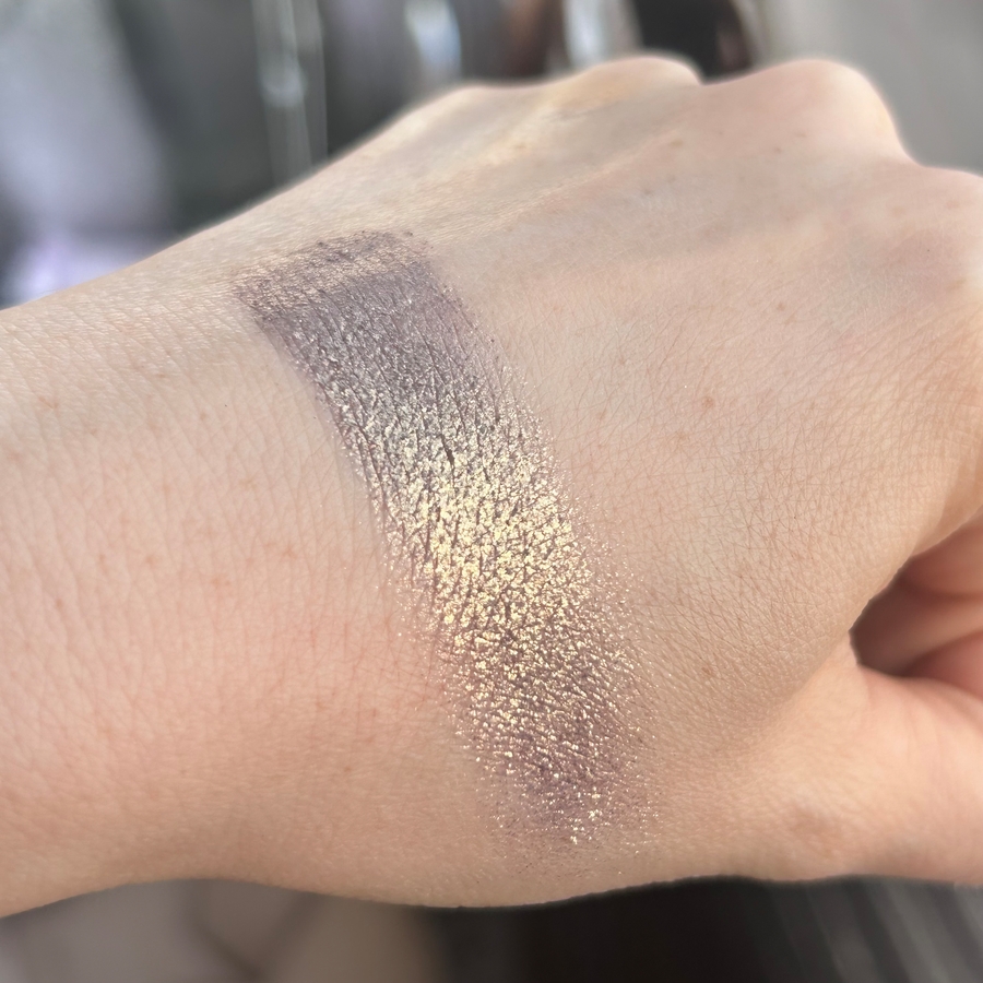 Цвет дуохромит из таупового-фиолетового в оливково-золотой, чем-то напоминает оттенок Тамми Танука «Облаченная в сонный бархат» из палетки «Тюлень». Разница в том, что тени тамми танука имеют в базе больше фиолетового, а в С147 больше серого цвета. Также визуально заметно, что С147 более блестящие, они не сглаживают веко в отличие от Тамми.