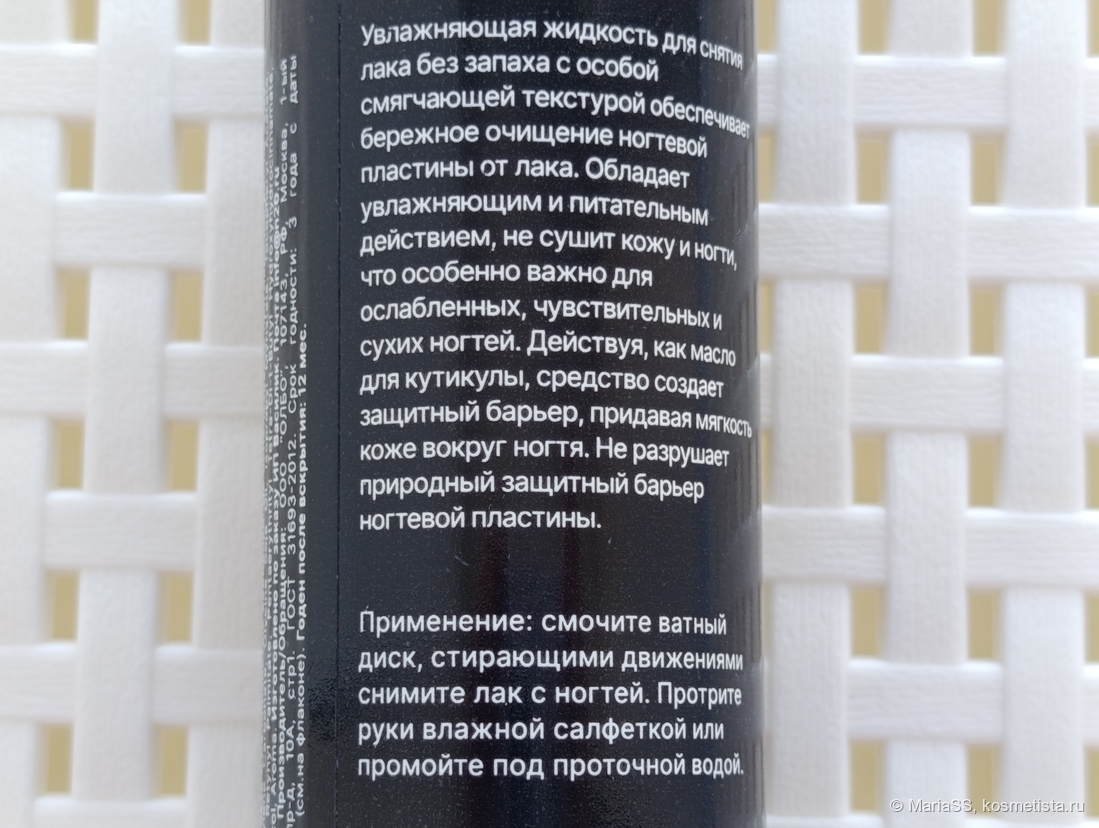 Жидкость для снятия лака находится внутри цилиндрического флакона из чёрного пластика объёмом 100 мл. Все надписи белого цвета. Строгий, минималистичный дизайн и отличное качество.
