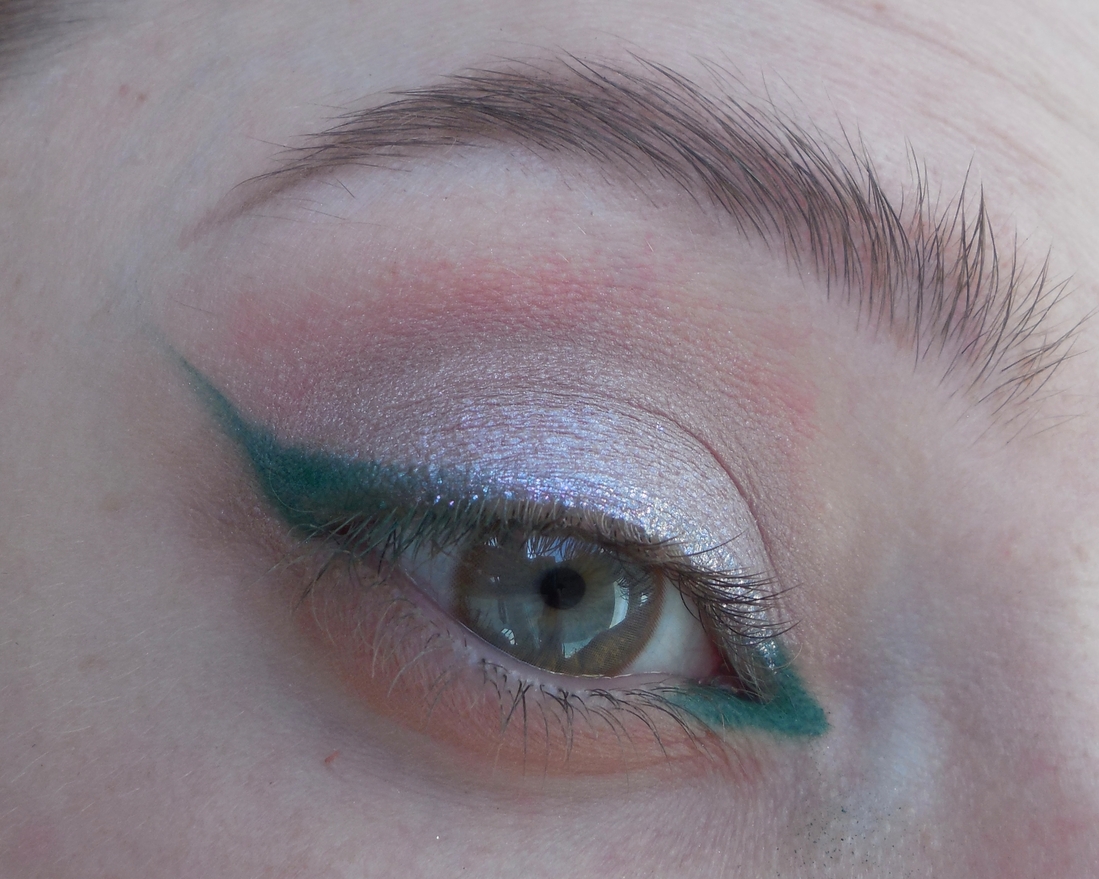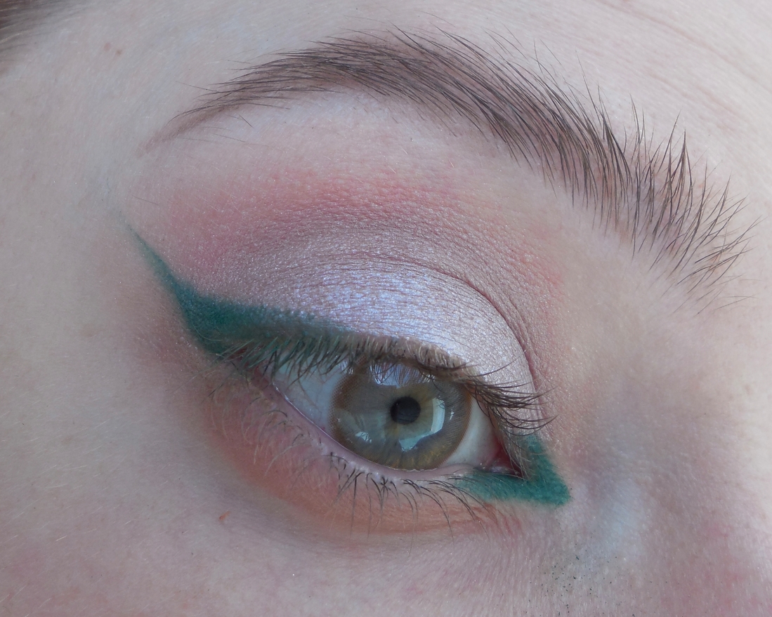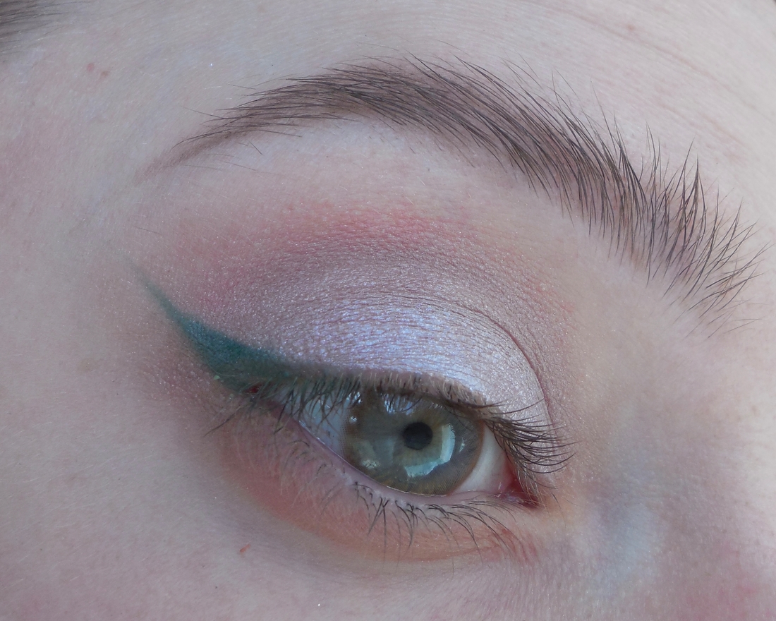 Далее от внутренний до внешней стрелочки нанесла вдоль ресничного края дуохромный сияющий аквалайнер. Сначала думала сделать совсем тоненькую полосочку, но всё же захотелось чуть побольше добавить.