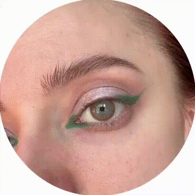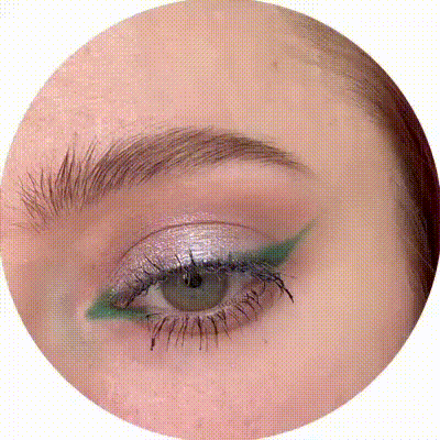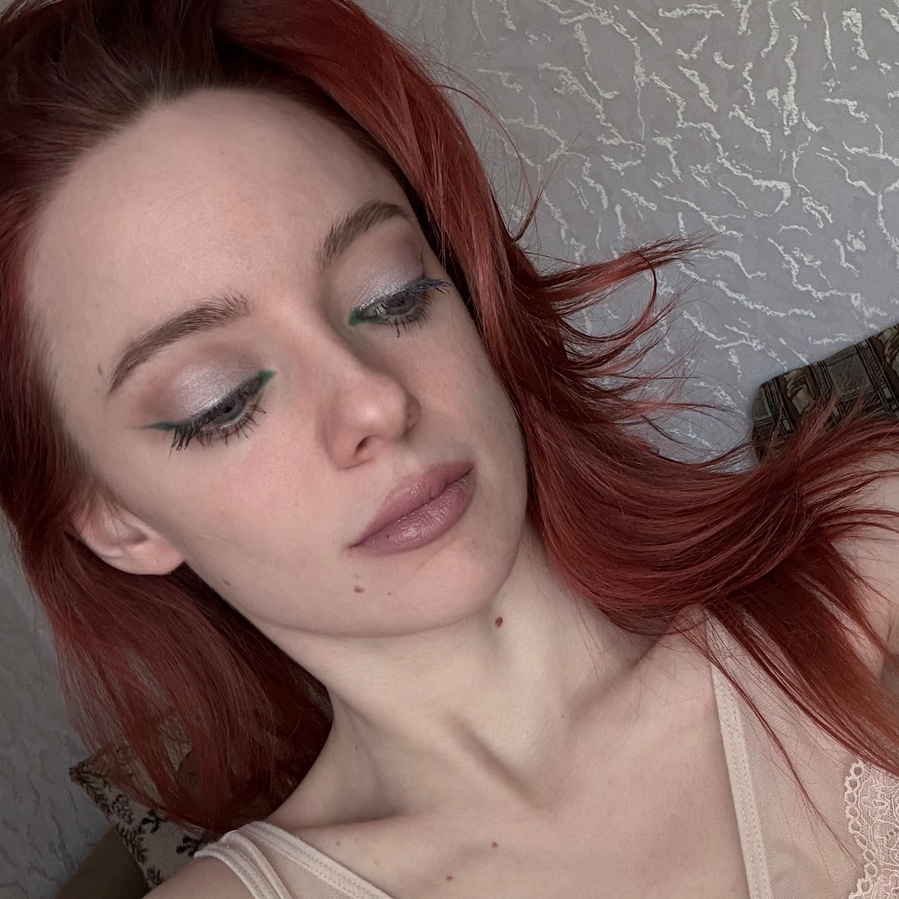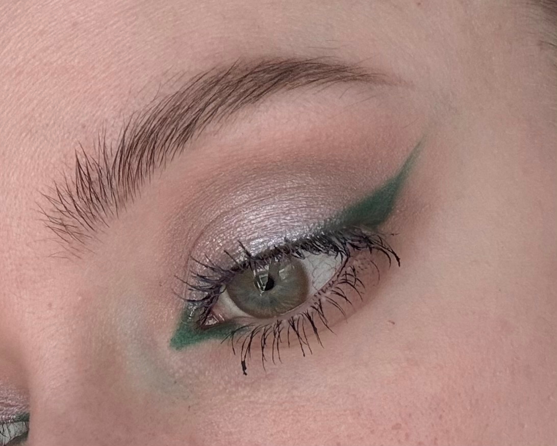 Добавлляю зелёную стрелочку тенями. Мило, нежно, свежо — ну точно весенний цветочек. Рисовала сухой плоской кистью для нейларта с жёстким ворсом.