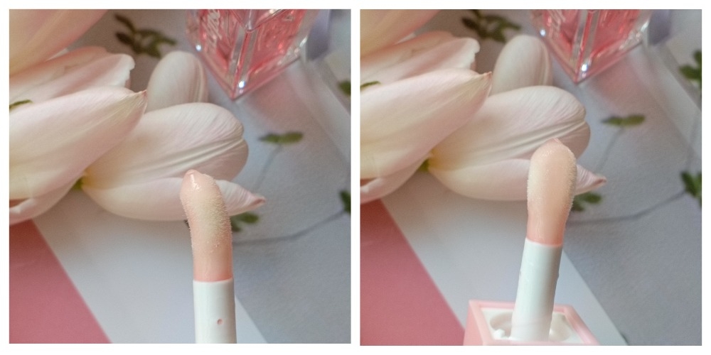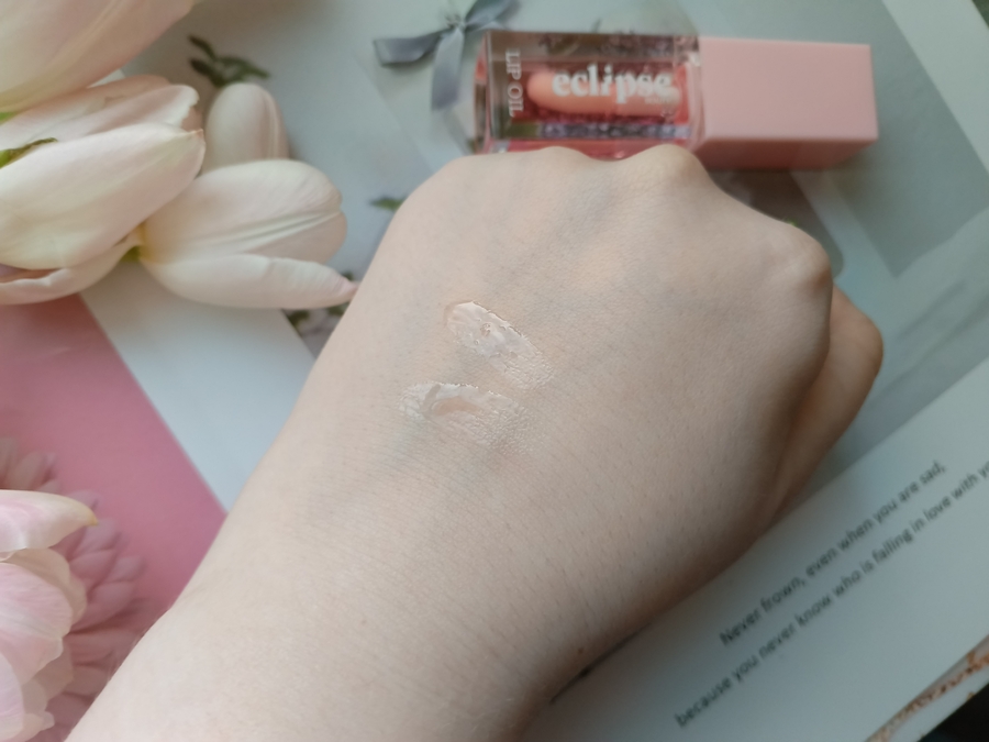 Оттенок имеет едва заметную розовинку и яркий стеклянный глянец. Мне очень нравится мягкая не липкая текстура, действительно масло, причем достаточно жидкое масло. Не жирное, не склеивает губы, практически не ощущается, если не тереть губы друг о друга.