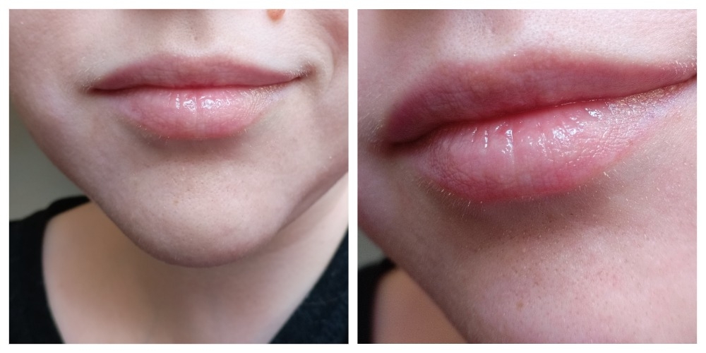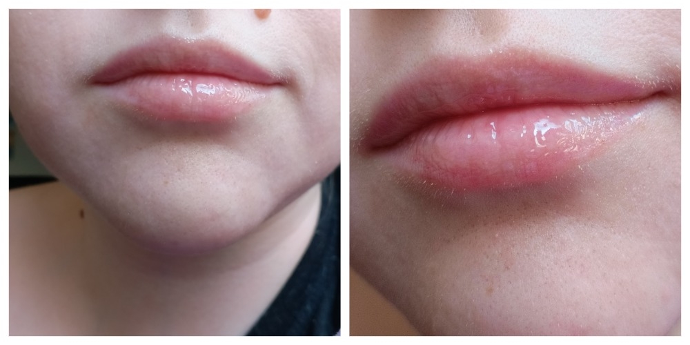 Масло имеет яркий заметный глянец, почти стеклянный. Разглаживает рельеф губ, мои вертикальные складки сразу меньше заметны. Вообще такой глянец слегка придает объема губам. Мне нравится и как оно смотрится, и как оно работает.