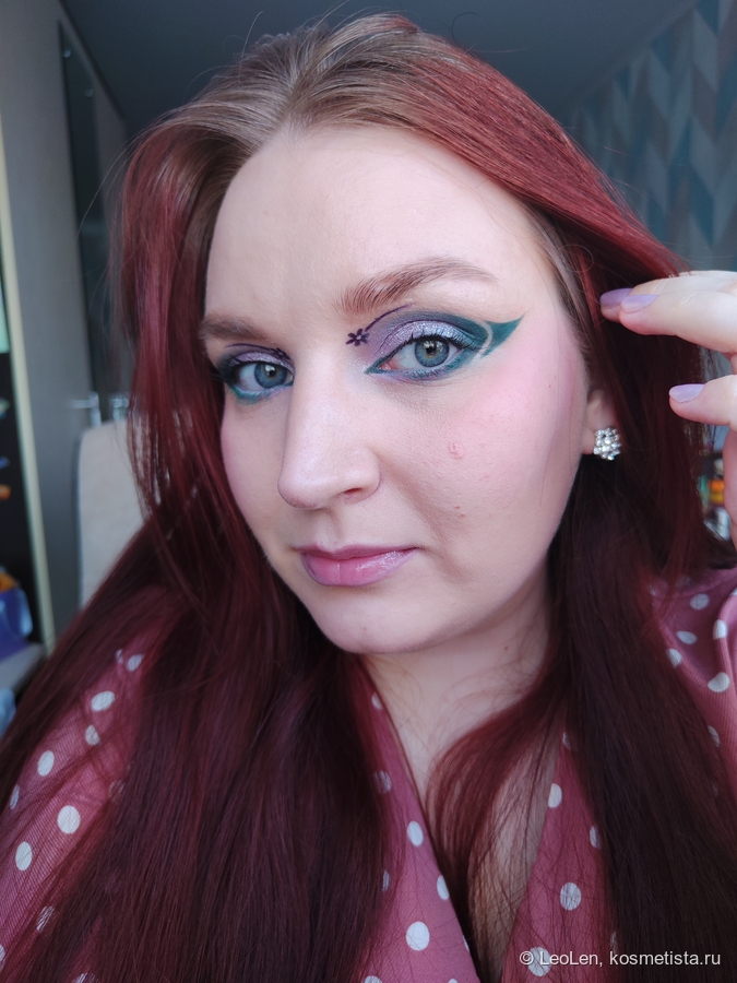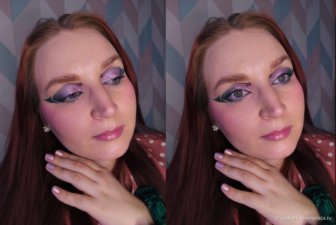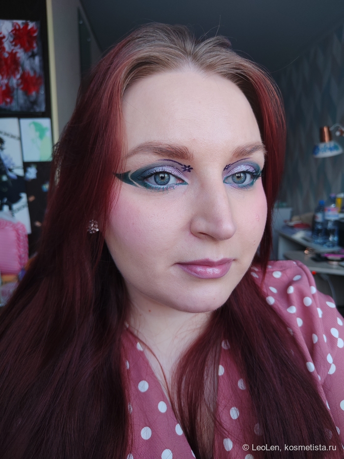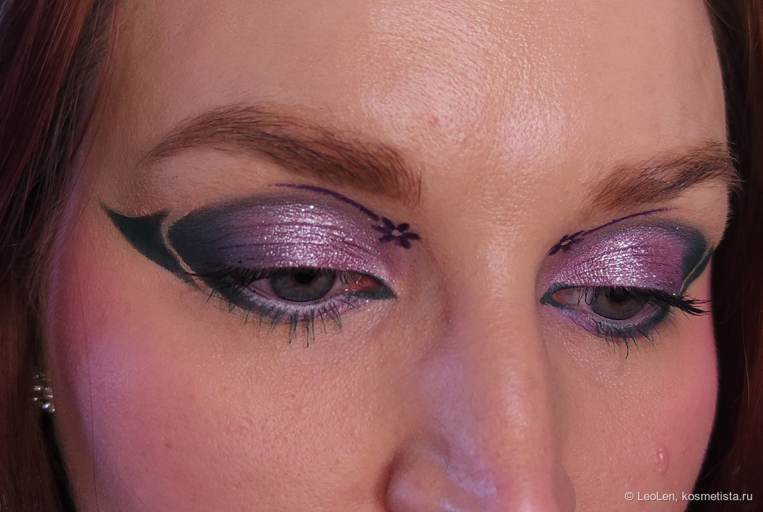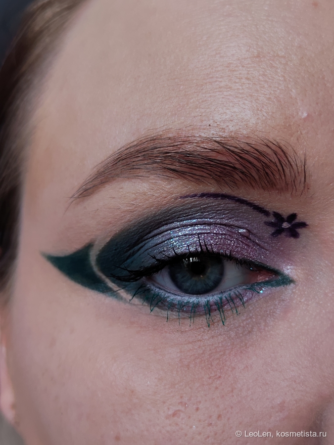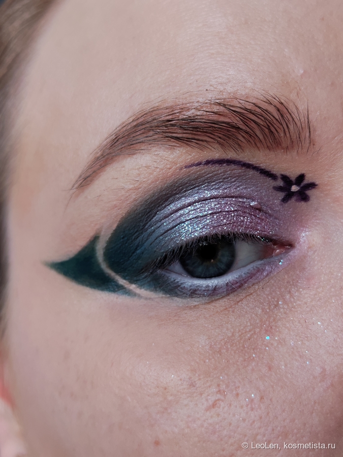 Чего-то мне не хватило, поэтому снова кистью №1 набрала оттенок Maria и нарисовала цветочек и полоску, стараясь сделать это симметрично с другим глазом. Тычинку нарисовала кистью №2 консилером.