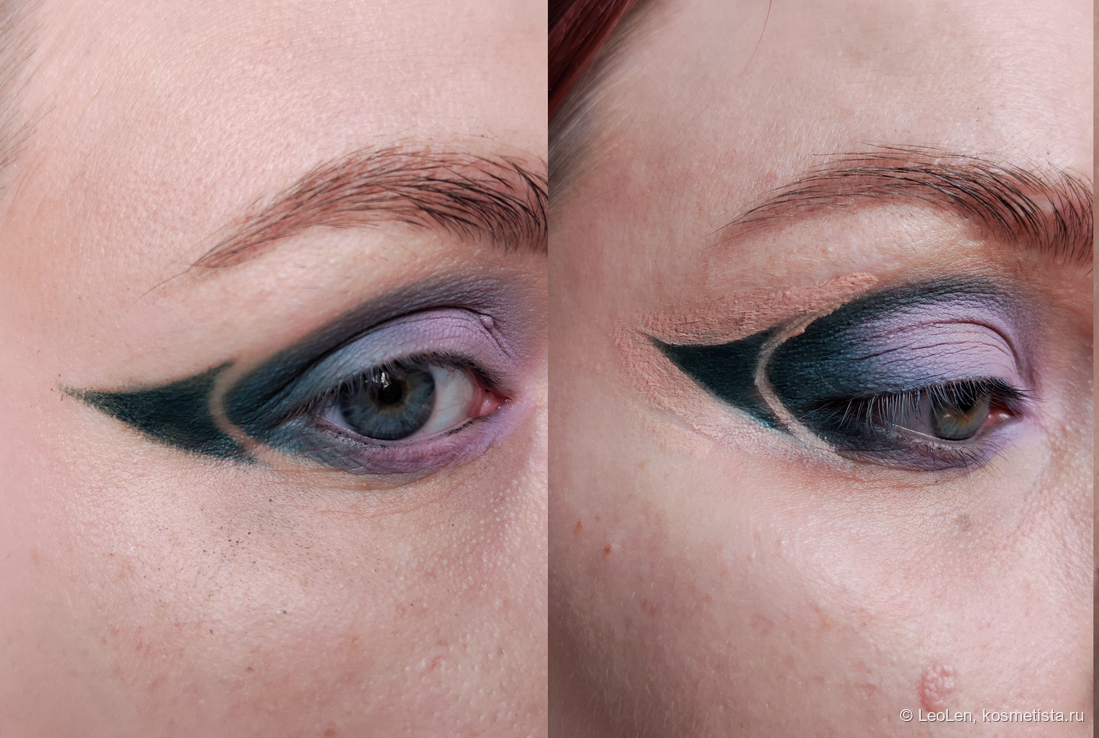 Дальше я снова беру кисть №1 и уже прохожусь по краям получившегося треугольника более плотным цветом зелёного. Очищаю кисть в мицеллярке, набираю консилер и подчищаю края и линию которую мы вырезали ранее. Консилер под бровью и там где ниже подтушевываю пальчиком.
