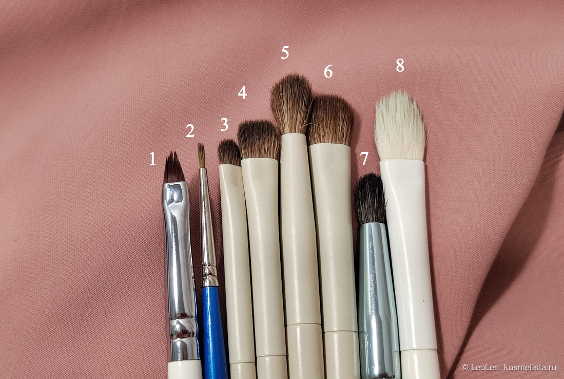 Я использовала много мелких кистей. Пронумеровала их для удобства, буду писать по номерам какие использовала. Номера 3 — 6 это кисти из набора китайского бренда Beili. Очень хорошенькие, мне нравятся. 07 тоже из какого-то китайского набора, но он был не очень. Я избавилась почти от всех. Осталась только эта кисть бочонок.