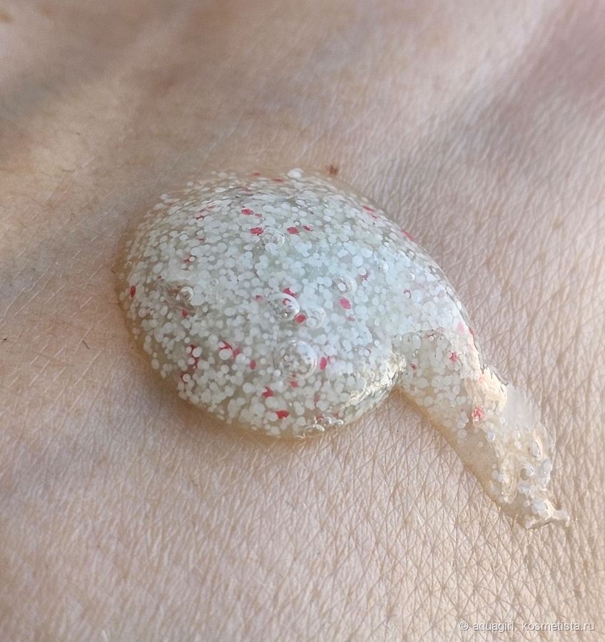 Гоммаж имеет прозрачную гелевую основу, в которой можно увидеть некоторое количество белых и красных скрабирующих частиц. При нанесении их на кожу они распределяются по всему телу и мягко отшелушивают кожу.