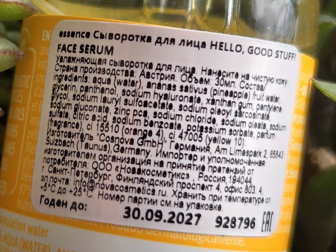 На обороте на стикере есть вся необходимая информация о продукте. В составе у сыворотки 90% натуральных компонентов, которые направлены на глубокое увлажнение кожи. Она имеет приятный фруктовый аромат. Легкая консистенция быстро впитывается и не оставляет неприятные ощущения липкости и жирности. Поддерживает оптимальный гидробаланс. После нее у меня проходят сухость и шелушения на лице. Использую ее как базу под макияж по утрам, с этим она отлично справляется. Сыворотка придает лицу свежесть и сияние.