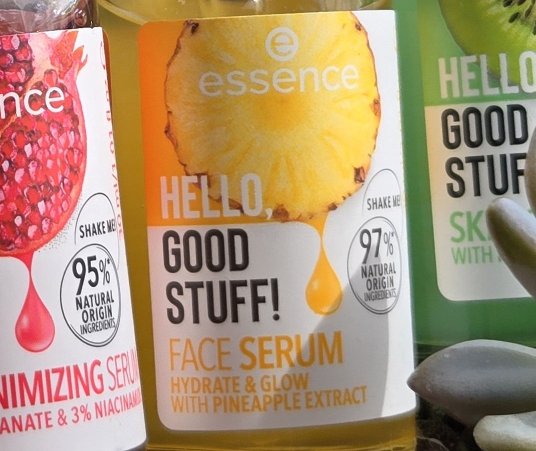 Следующая Сыворотка увлажняющая Hello, Good Stuff! Face Serum Essence. Она с таким же сочным дизайном что и остальные. У нее ананасик нарисован на этикетке, потому что его экстракт есть в составе, а также есть глицерин, пантенол и гиалуроновая кислота. Она подойдет под любой тип кожи. Сыворотка веганская и не тестировалась на животных, не содержит парабены, минеральные масла и частицы микропластика.