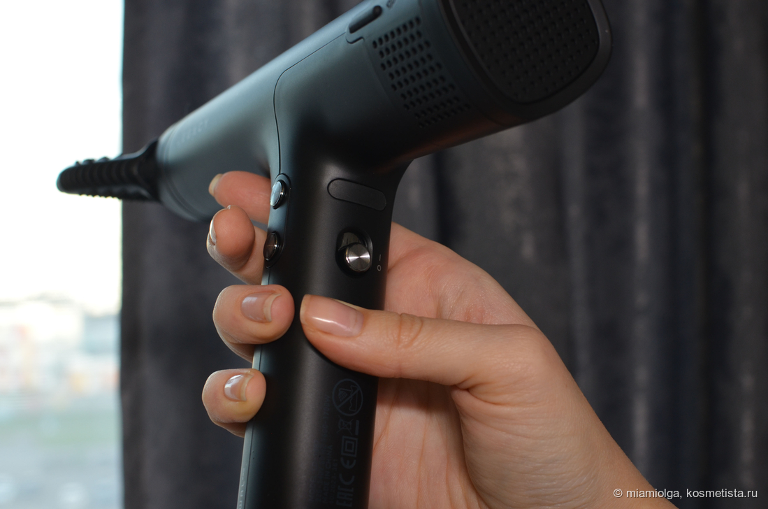 Нижняя кнопка — мощность потока, верхняя — температурный режим. Я левша и часто задеваю верхнюю клавишу. Сбоку кнопка-бегунок включения-выключения. С противоположной стороны есть клавиша быстрого охлаждения потока воздуха.