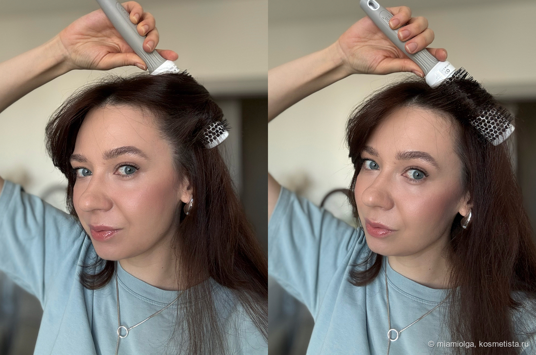 - Теперь переходим к длине. Для вытягивания волос использую браш 35 мм Olivia Garden. Если волосы успели подсохнуть, то прохожусь спреем-термозащитой волос Airex Estel. Сначала сушу волосы «внутрь», подкручивая кончики.
