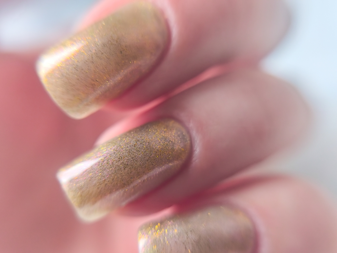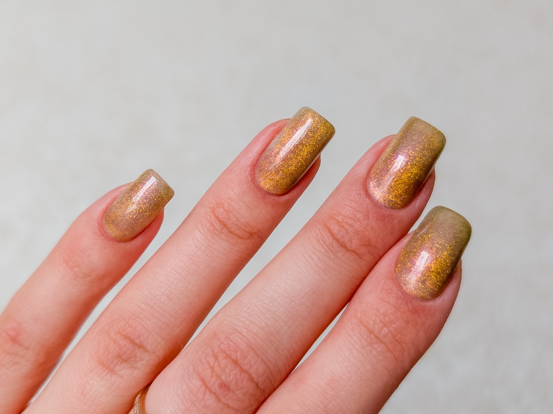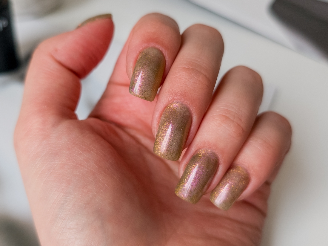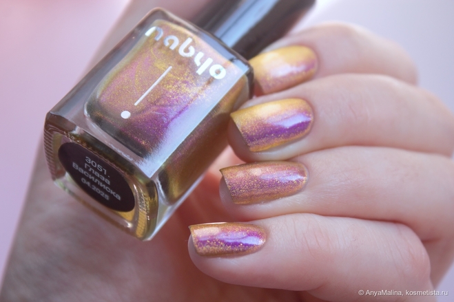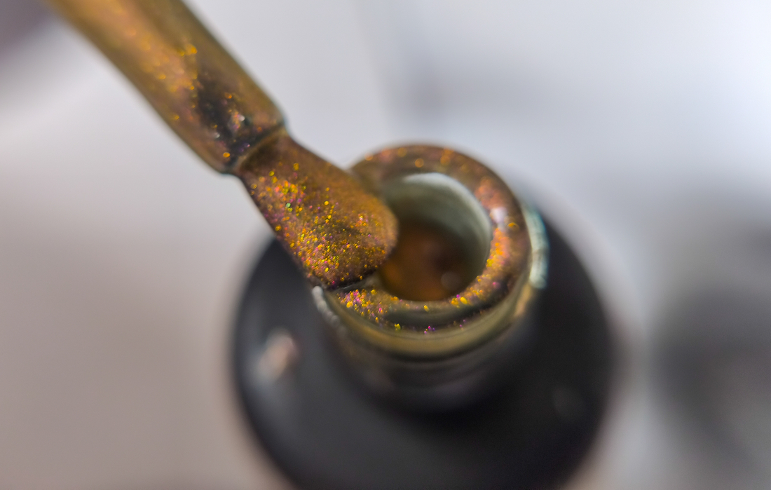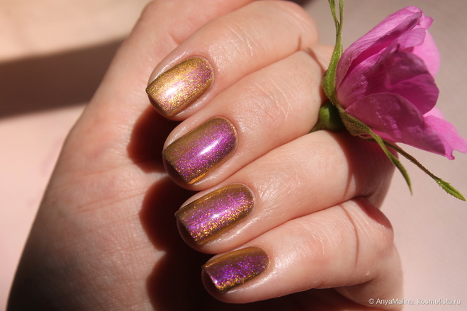 При выборе оттенка я отталкивалась от изображения на сайте, там, как и на стикере, гель-лак выглядел как тёмно-фиолетовая база с шиммером и желтым кошачьим бликом. Но в реальности он оказался совсем другим, золотисто-медно-зеленым. Сложный цвет, просто так словами и не опишешь, но действительно очень похож на оттенок глаз кобр или гадюк. И я старалась магнитить его по-разному, но как на промо снимках все равно не получалось. Фиолетовый перелив уловить трудно, но он есть и если рассмотреть гель-лак под макро объективом, то можно увидеть, что шиммер тут не самый мелкий и напоминает нарезанные кусочки слюды.