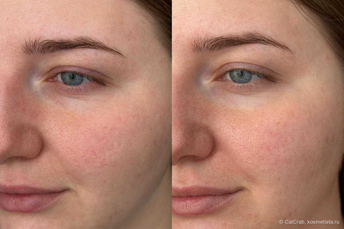 На лице камера практически не передаёт этот финиш, но знайте: в жизни она выглядит более сияющей, чем на фото до и после: