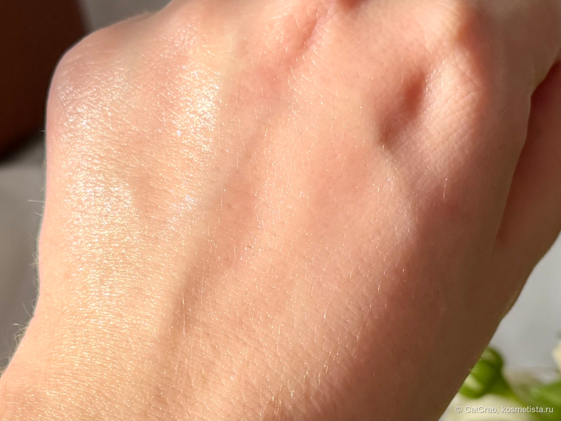 Распределяется легко, впитывается быстро, оставляет сияющий финиш — никаких сияющих частиц в составе нет, это просто равномерное влажное подсвечивание кожи.