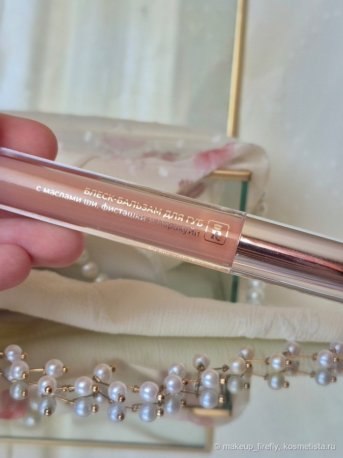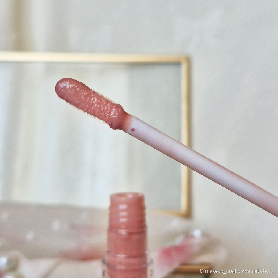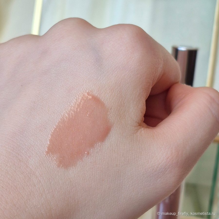 Изначально, когда думала, что добавить, вспомнила о том, что у меня совсем нет нюдовых блесков, и вот на глаза попался он. Я купилась на фото с маркетплейса, на котором оттенок совсем отличается от реальности, но проверить на официальном сайте я не додумалась. На фото блеск был с холодным серо-коричневым оттенком, а в жизни оказался почти прозрачным.