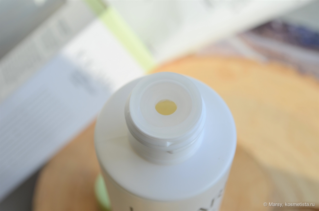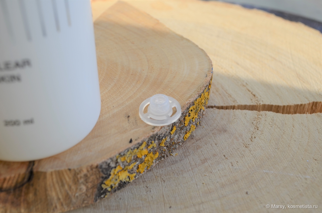 Сам тоник упакован в пластиковый флакон лаконичной округлой формы с минимальным дизайном в пастельных оттенках. Крышка откручивается полностью и внутри нас ждёт заглушка дозатора.