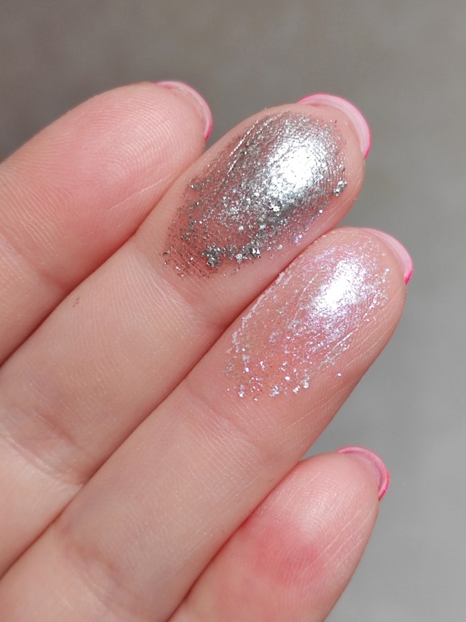 Последний оттенок, раположенный справа — имеет нежный, бело-розовый оттенок, и содержит ярко-розовые, бирюзовые и голубые блесточки.