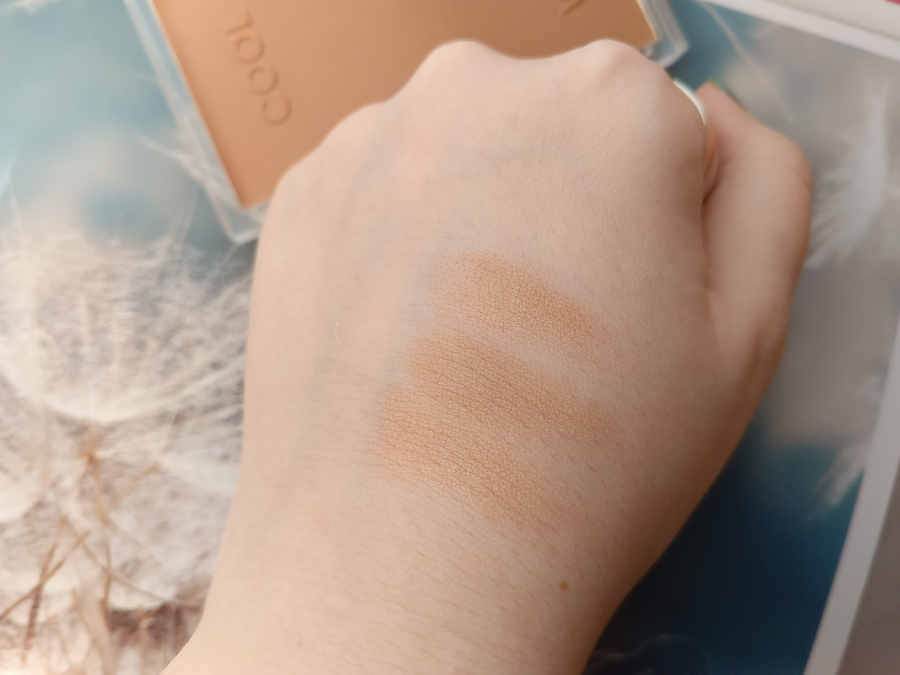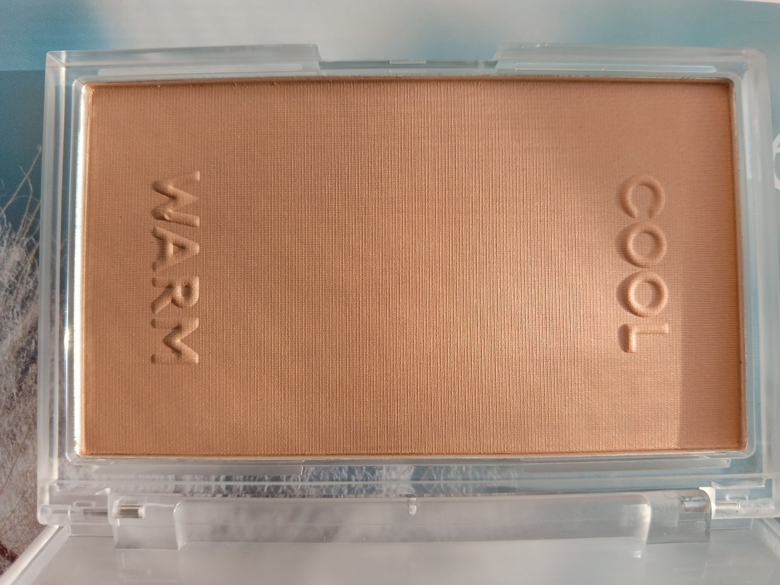 На свотчах ниже слева направо я показываю холодный оттенок, затем теплый, а затем их общую смесь. Как по мне, теплый оттенок здесь удался больше всего. Он более коричневый, и менее рыжий, хотя интуитивно кажется, что это должен быть холодный тон. По текстуре бронзер средний. Не мягкий, но и не жесткий. Пигментация тоже средняя. Можно нанести прозрачно, можно наслоить.