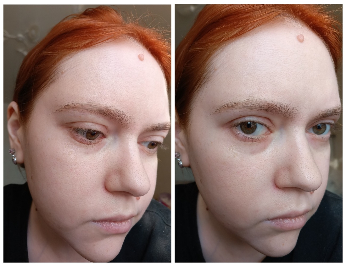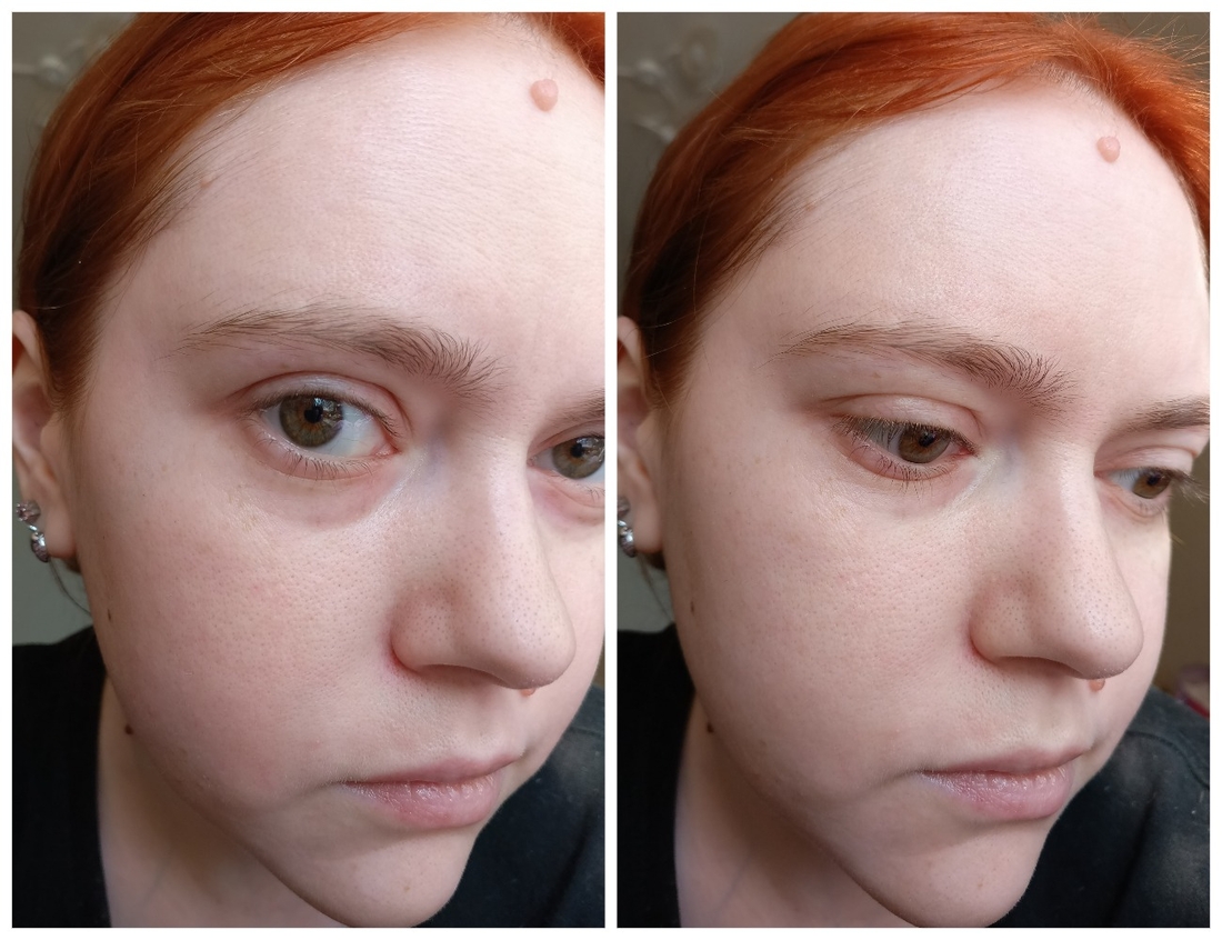 На коллаже ниже слева голая кожа, справа кожа с праймером. Смотрится немного свежее, но в отстальном ни яркого сияния, ни желтизны нет. Для меня это плюс, хорошее средство, которым комфортно пользоваться.