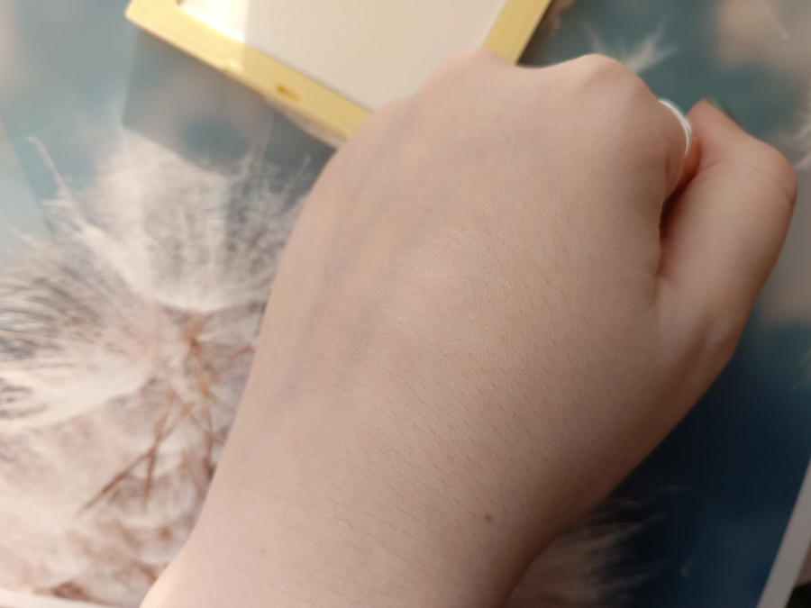 Сам праймер светло бежевый с золотистым сиянием. Но на коже в итоге выглядит практически прозрачным. Отдельных блесток не видно, и они очень мелкие, создают лишь деликатный перелив.
