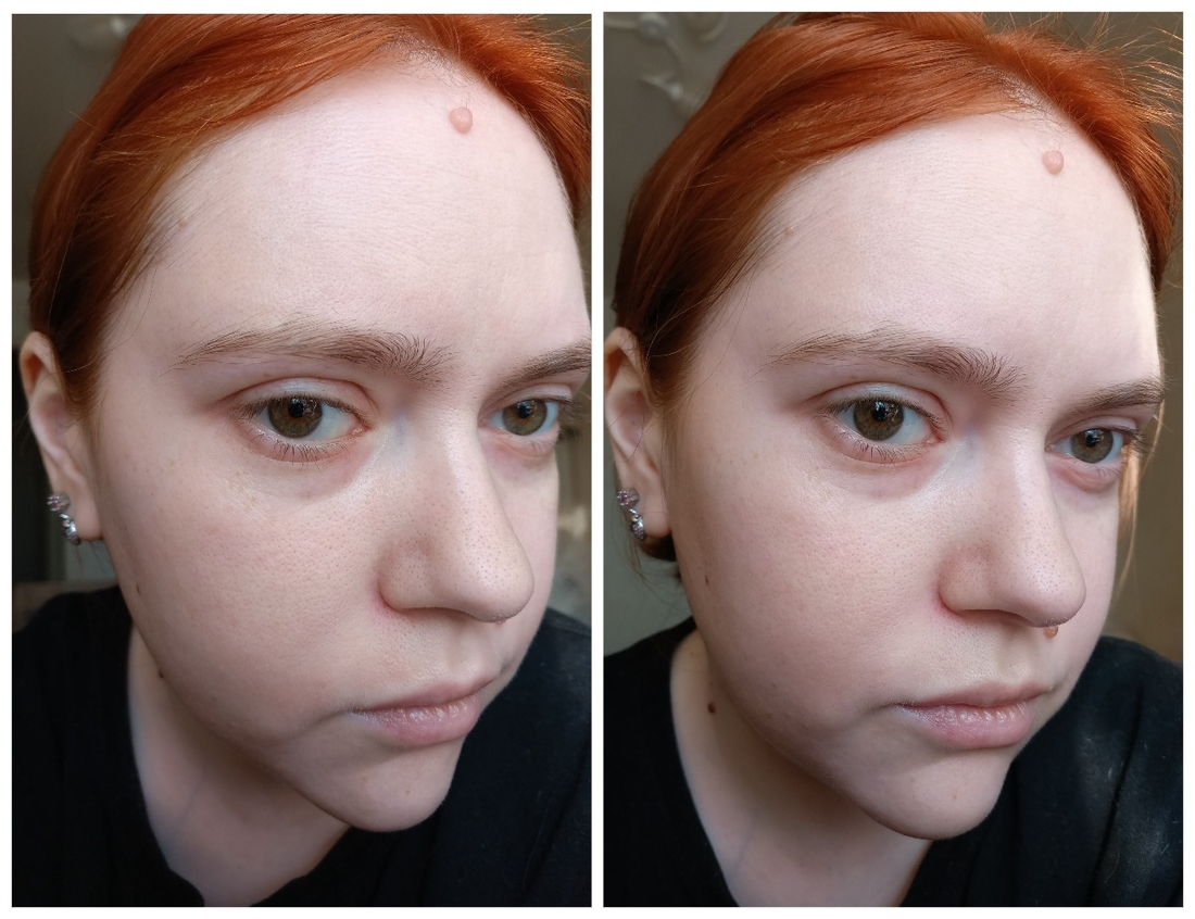 На коллаже ниже слева кожа с праймером, справа поверх нанесена пудра. Кожа чуть более ровная и матовая. На мой взгляд, это пудра для беспроблемной кожи. Потому что если праймер увлажнял, то пудра слегка матирует, а соответственно и подсушивает. На сухую кожу с шелушениями не ляжет.