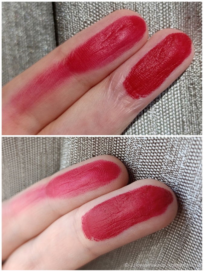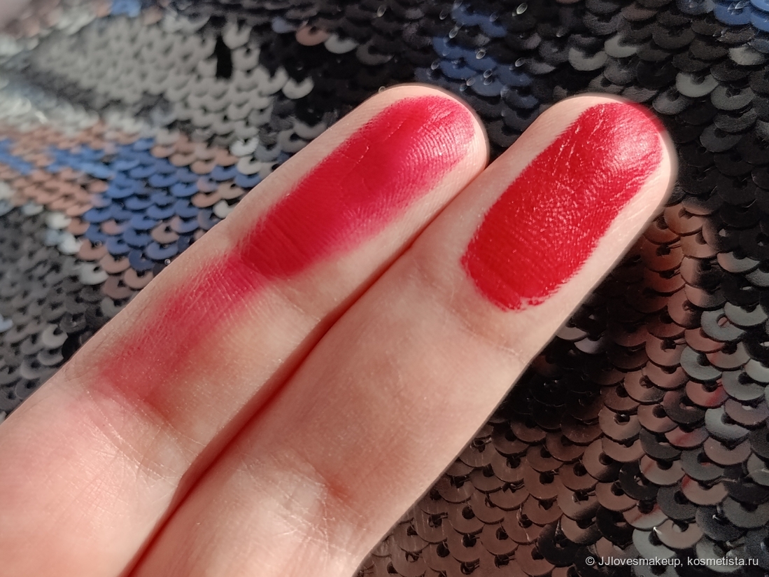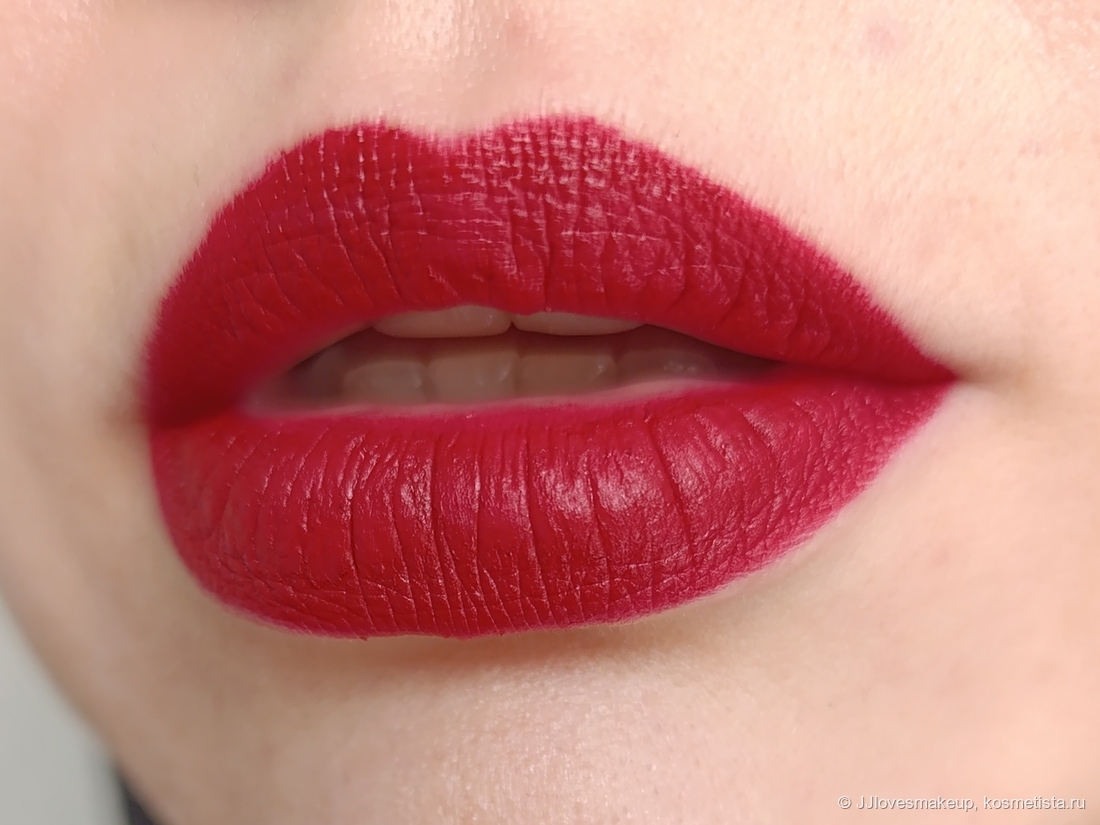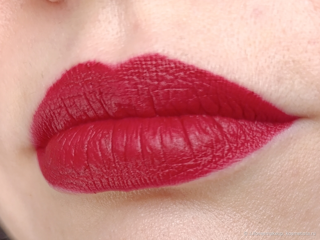 Плотность/прозрачность: оттенок плотный, перекрывает пигмент губ на 100%, если растянуть крошечный мазок, то получится тонкая красная дымка, достаточно яркая. Помада не гиперпигментированная, но при этом цвета достаточно, пигмент ложится плотно.