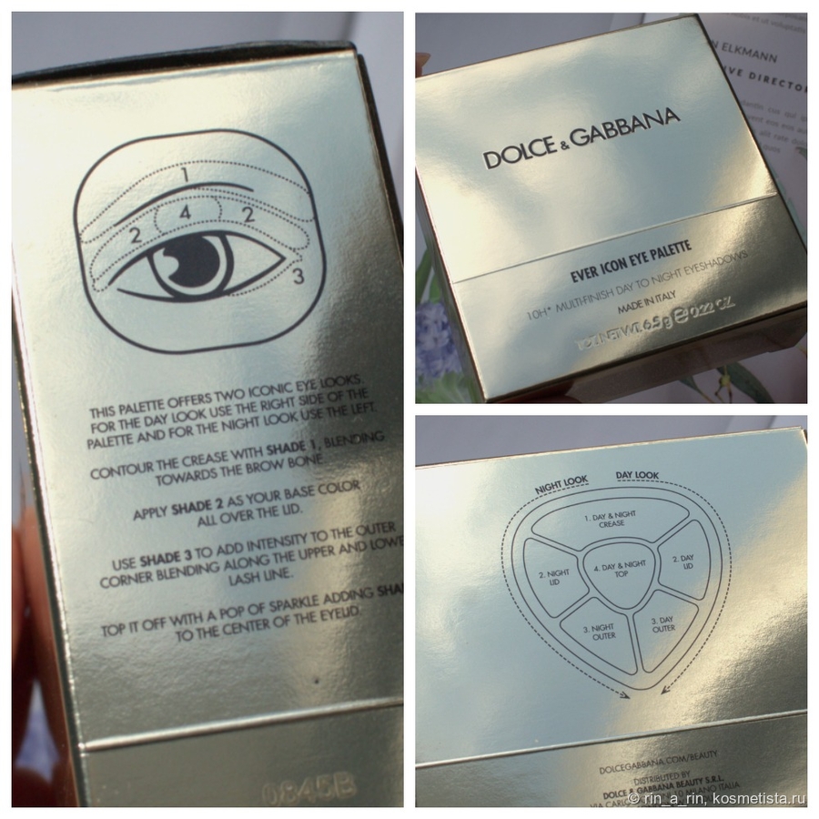 Тени были упакованы в глнцевую коробку золотого цвета. Не особо я люблю описывать упаковки, поэтому посмотрим на нее в виде коллажа. Тут же предложена схема макияжа, которую я, если честно, заметила только делая фотографии на обзор. Ну и в макияжах ее не использовала.