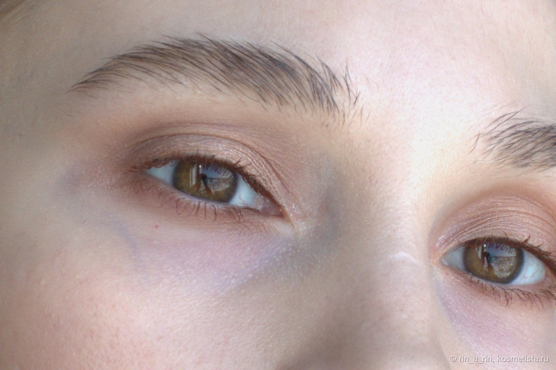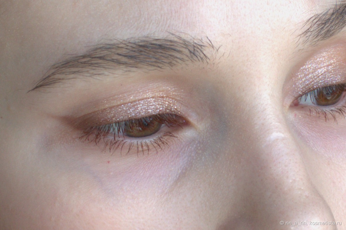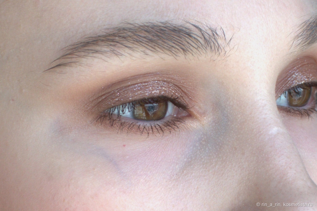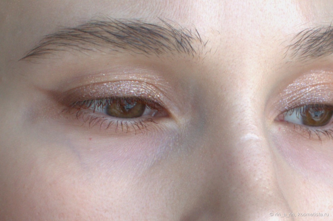 Сияющие оттенки (два сатина и спаркл) тоже достаточно беспроблемные: веки не жуют, в складку века не скатываются, не осыпаются при носке. Осыпаться при нанесении на веко может спаркл, но и то не критично. Эти оттенки я наношу на веко пальцем и растушевываю кистью их границы.