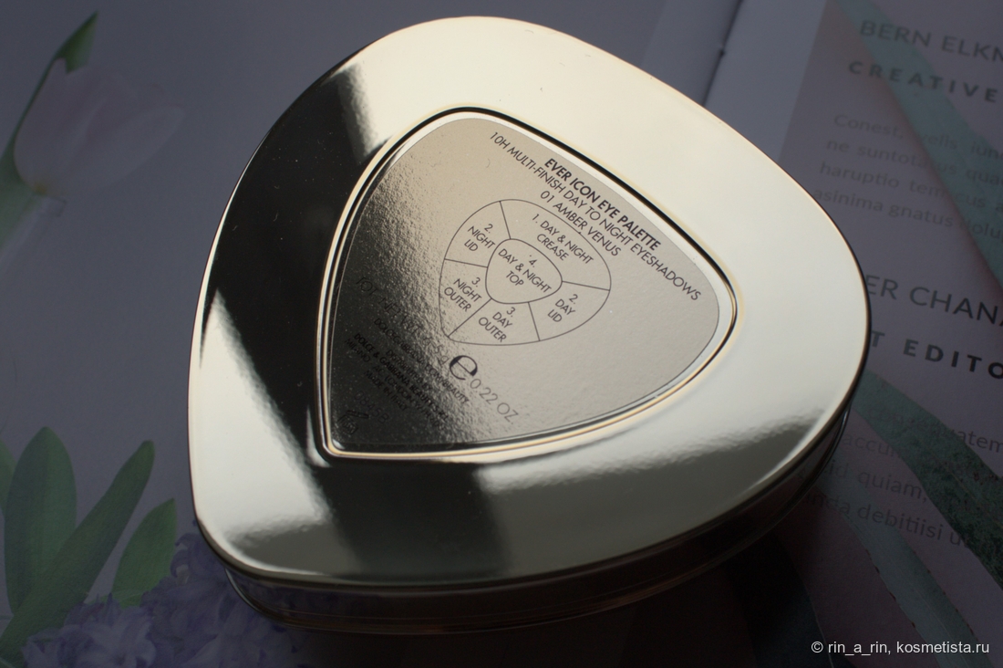 На обороте футляра указана та же схема деления теней на день/ночь. Крышка у палетки открывается на 90 градусов, внутри имеется зеркало.